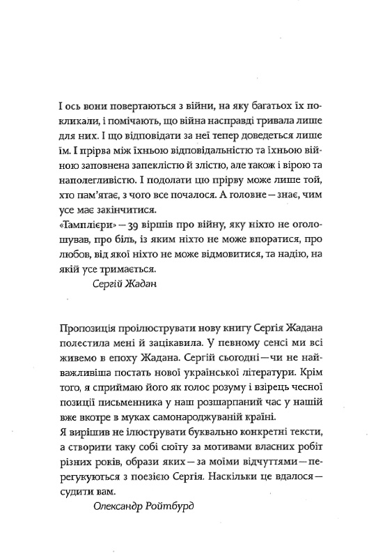 «39 віршів про війну, яку ніхто не оголошував, про біль, із яким ніхто не може впоратися, про любов, від якої ніхто не може відмовитися, та надію, на якій усе тримається». Сергій Жадан.
