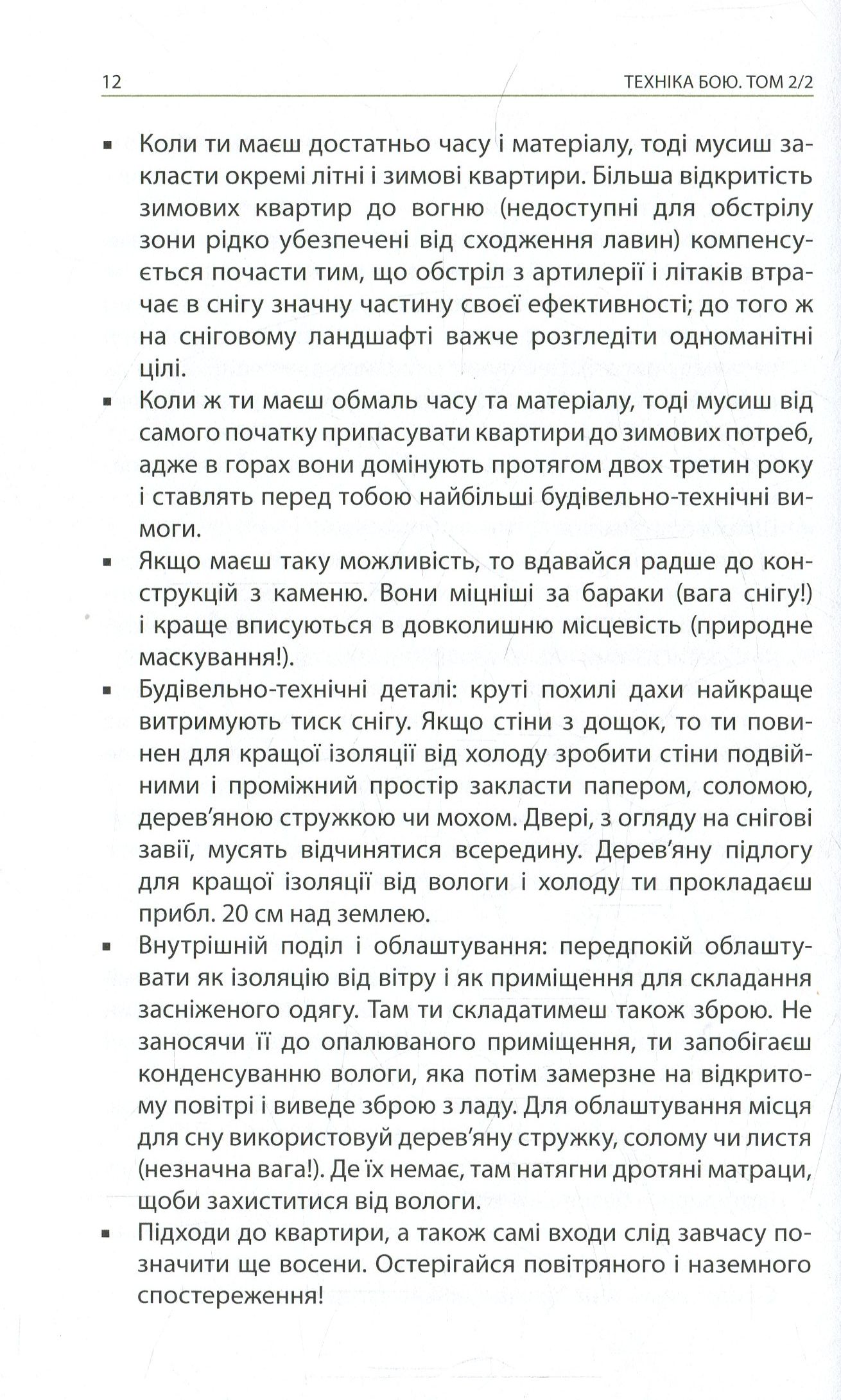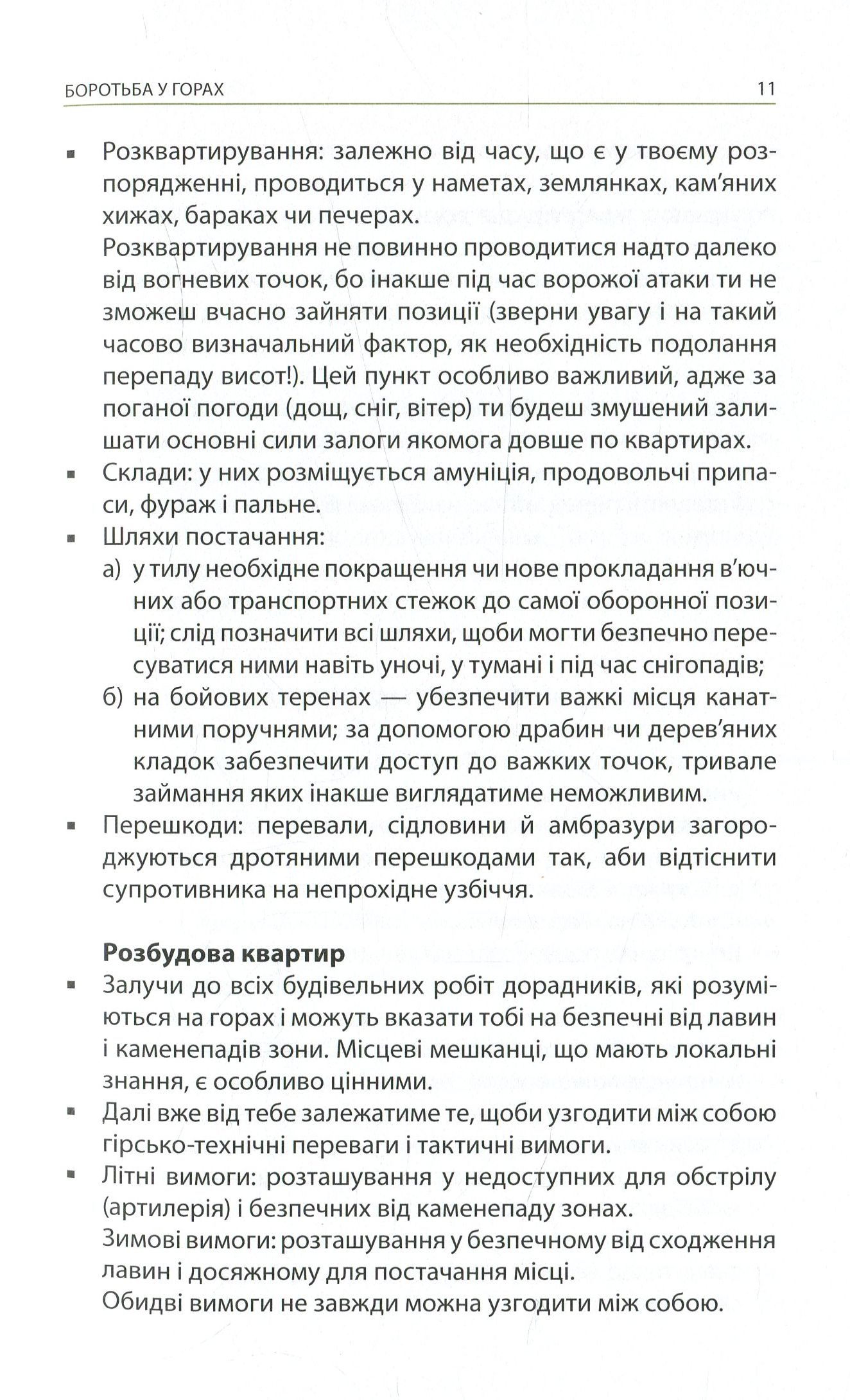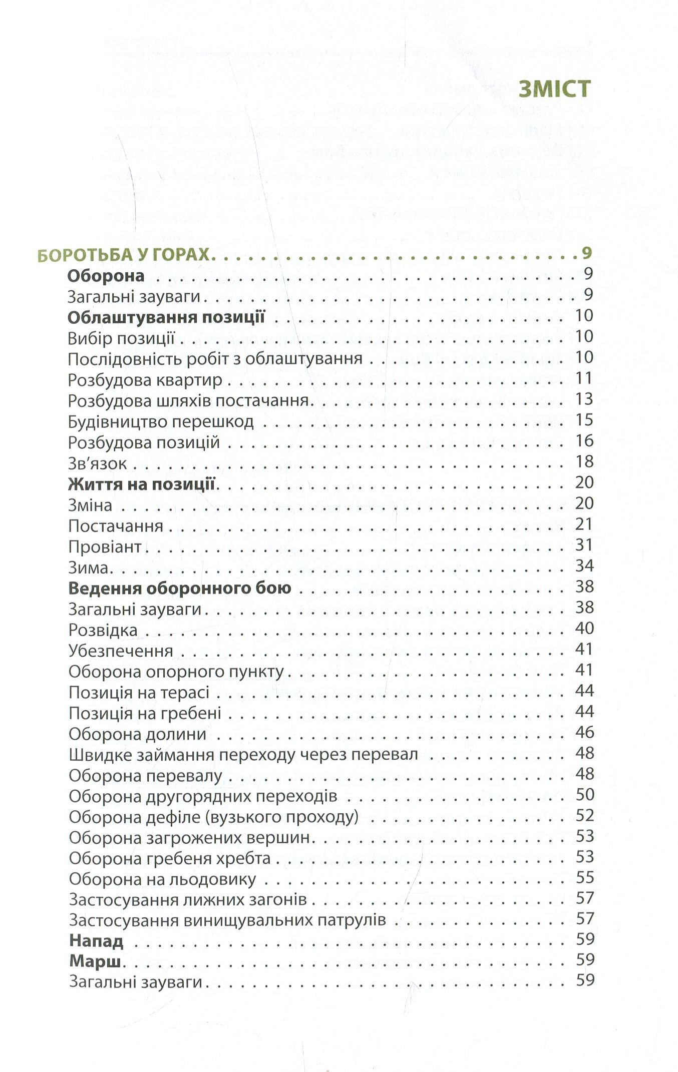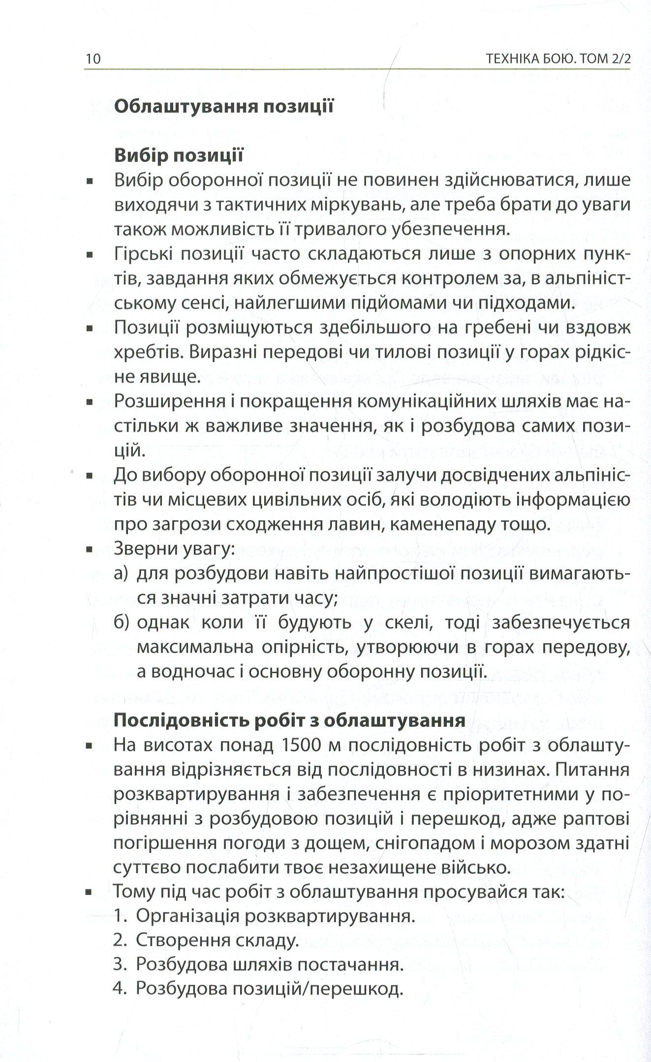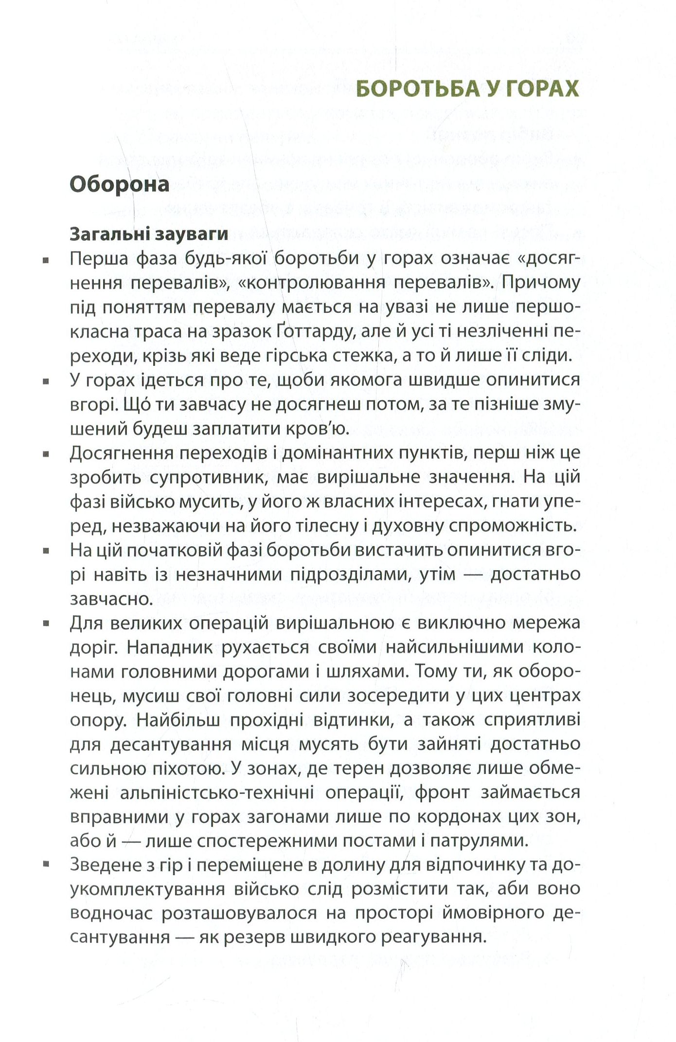Фундаментальний швейцарський підручник з основ загальновійськового бою від автора «Тотального опору». У ньому детально і доступно описано техніки сучасного бою і командування військовими підрозділами, розвідки і диверсійної роботи, особливості застосування зброї, будування фортифікаційних споруд та інженерних загороджень, правила організації маршу та розквартирування, постачання війська, санітарної служби, військового вишколу тощо. Професійний, але пристрасний текст військового фахівця і патріота несе потужний мотиваційний потенціал, а доповнений рисунками, схемами і таблицями може бути легко засвоєний. Призначається для офіцерів, сержантів, рядових Збройних Сил України, а також усіх, хто хоче належно підготуватися до захисту своєї країни від агресії ворога та збільшити свої шанси на виживання у бою. У цій частині розкриваються основи ведення бойових дій у горах, а також принципи контрдиверсійної боротьби.