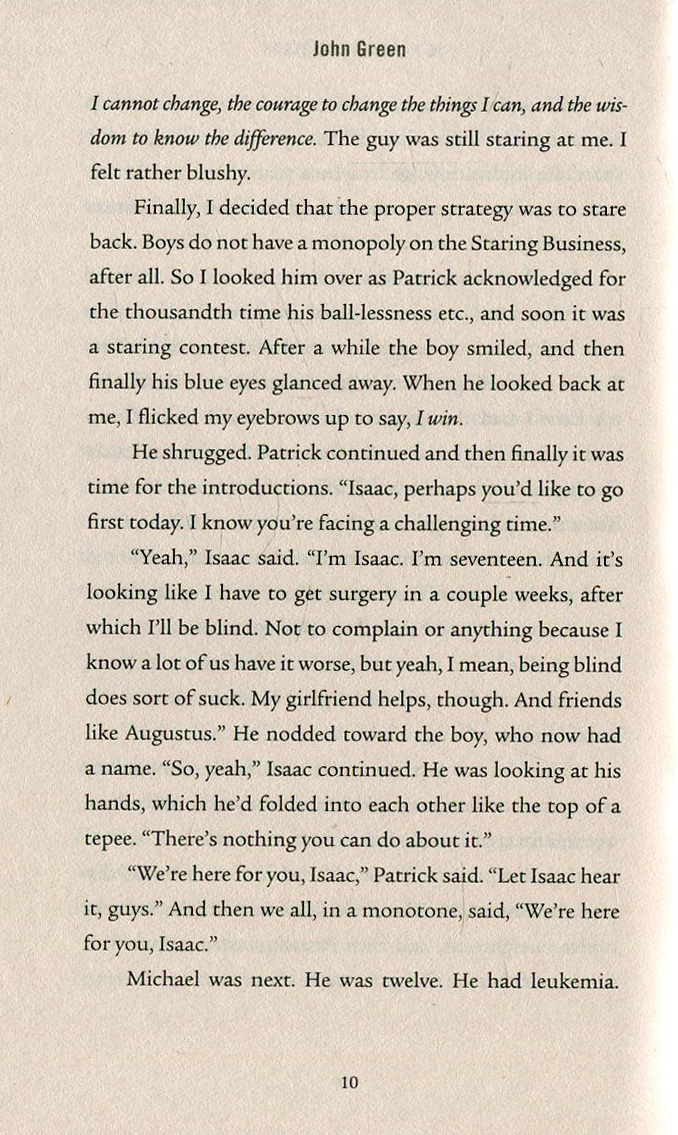 The Fault in Our Stars is award-winning author John Green's most ambitious and heartbreaking work yet, brilliantly exploring the funny, thrilling and tragic business of being alive and in love. Despite the tumor-shrinking medical miracle that has bought her a few years, Hazel has never been anything but terminal, her final chapter inscribed upon diagnosis. But when a gorgeous plot twist named Augustus Waters suddenly appears at Cancer Kid Support Group, Hazel's story is about to be completely rewritten.