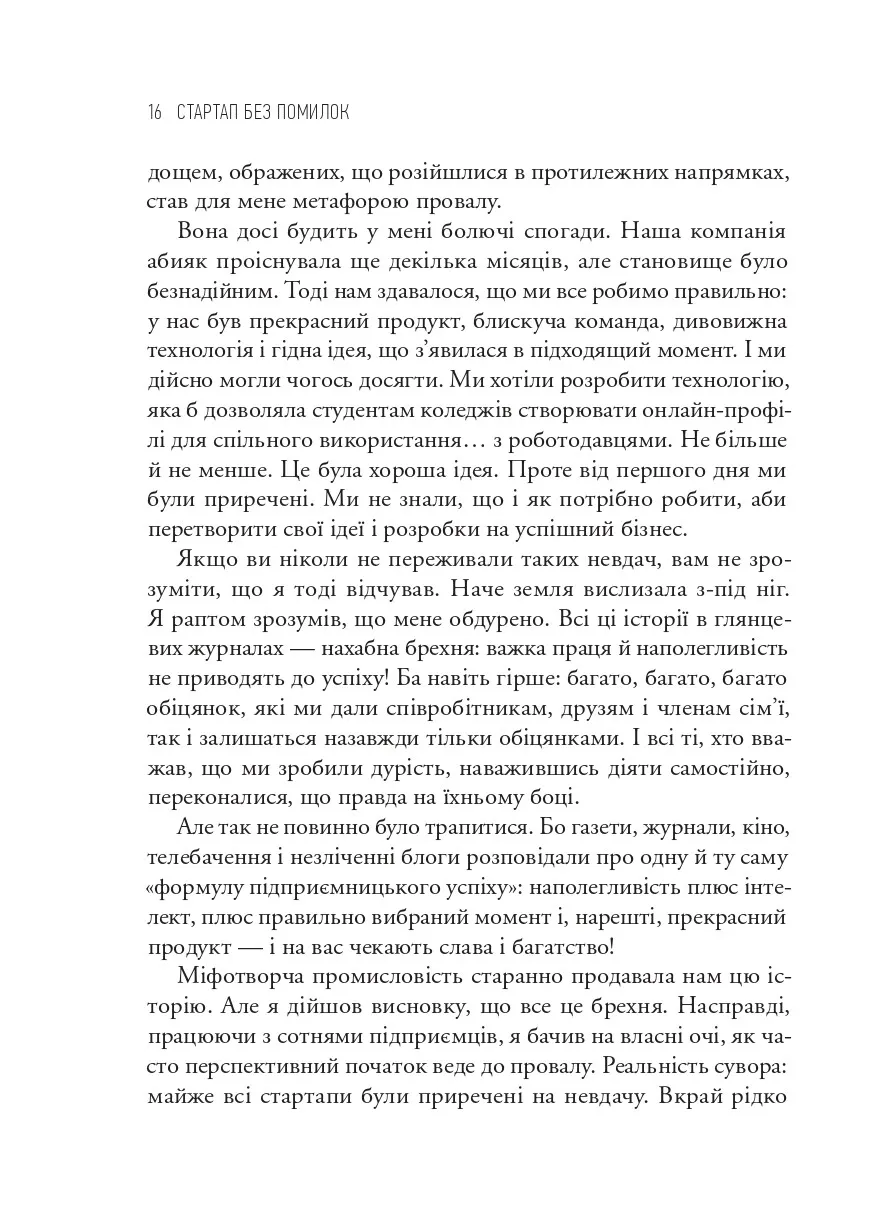 Настав час припинити марнувати свій і чужий час та почати змінювати світ на краще, зокрема й у галузі бізнес-технологій. Саме завдяки книжці The Lean Startup навчитися створювати власний прибутковий бізнес зможе кожен. Безумовно, читачі неабияк надихнуться концепцією Еріка Ріса — успішного підприємця, викладача Гарвардської школи бізнесу, консультанта з розвитку стартапів.