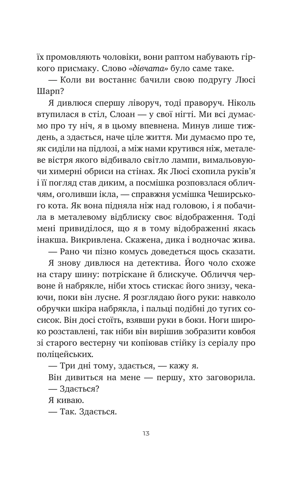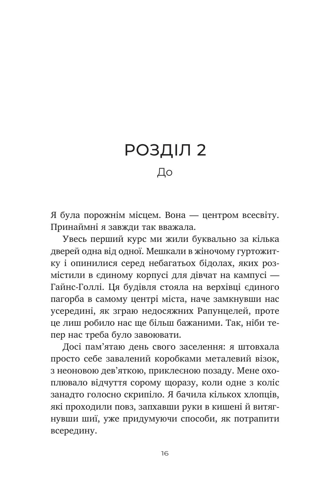 І ось Марґо опиняється в будинку поза кампусом з трьома іншими дівчатами: лідеркою Люсі, саркастичною Слоан і милою Ніколь. Вони різні, але водночас тісно пов'язані. Цей рік стане для Марґо переломним: вона нарешті вийде зі шкаралупи, у якій жила після смерті найкращої подруги Елізи. До середини другого курсу Марґо й Люсі стануть нерозлучними подругами — аж поки одного дня хлопця із сусіднього братства не знайдуть жорстоко вбитим... а Люсі Шарп не зникне без сліду.