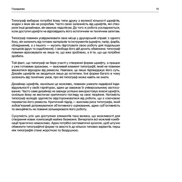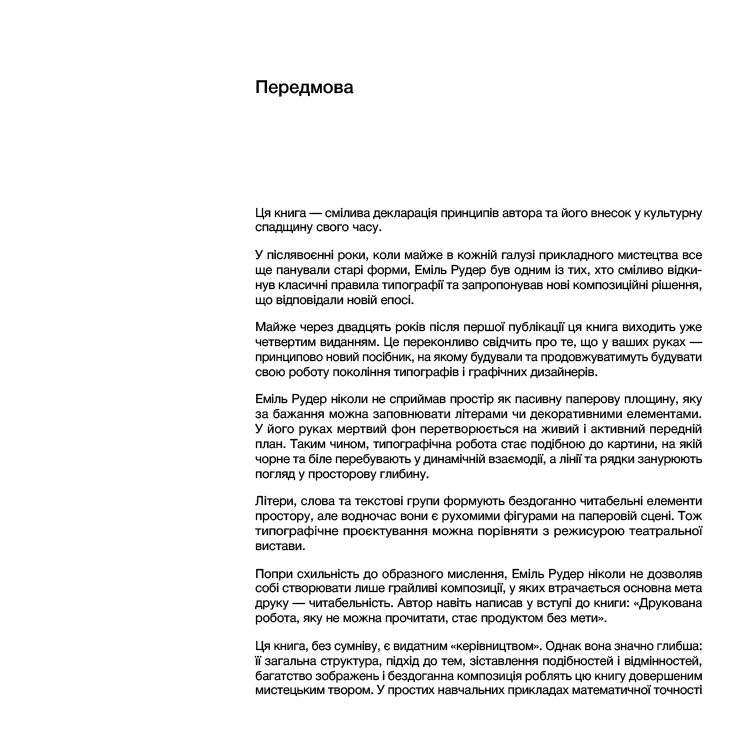 Книга «Типографія» є спадщиною Еміля Рудера, одного із засновників швейцарського стилю в дизайні, відомого в усьому світі за використання асиметричної верстки, модульної сітки, шрифтів без засічок, вирівнювання по лівому краю та порожнього простору на сторінці.Його методологічний підхід до типографії визнаний графічними дизайнерами в усьому світі. Видання містить чітко структуровані теми, ілюстрації та гармонійно дібрані шрифти, а також міркування автора про принципи дизайну загалом.Сьогодні, через більш ніж п'ятдесят років після першої публікації цієї книги, чимало її тез досі є актуальними та засадничими, водночас з деякими ви можете подискутувати, враховуючи нові тенденції у світовому дизайні.