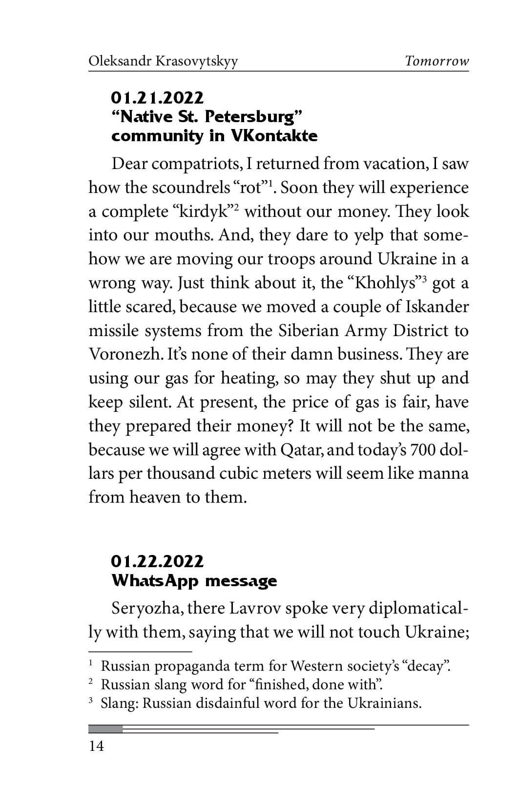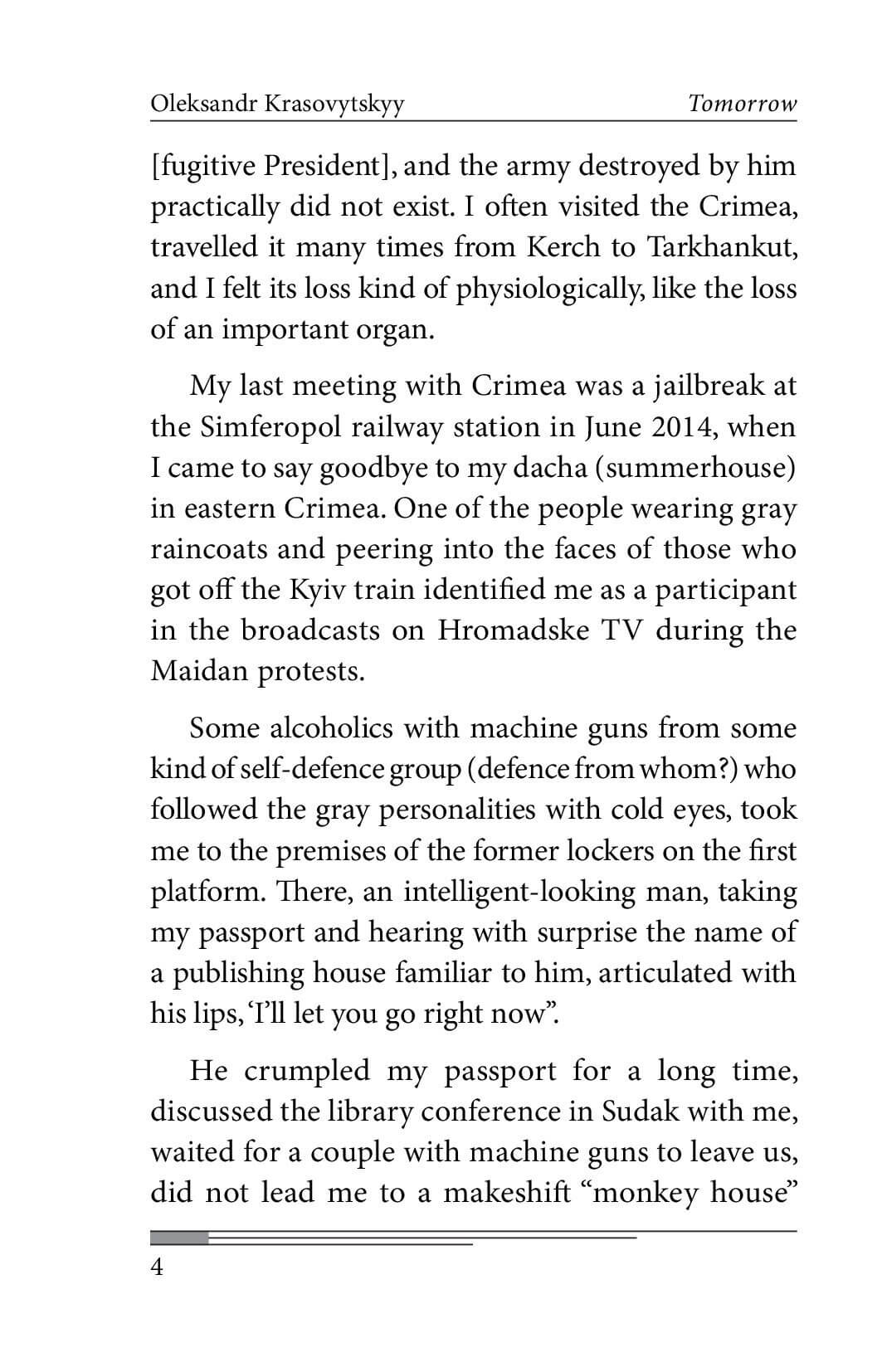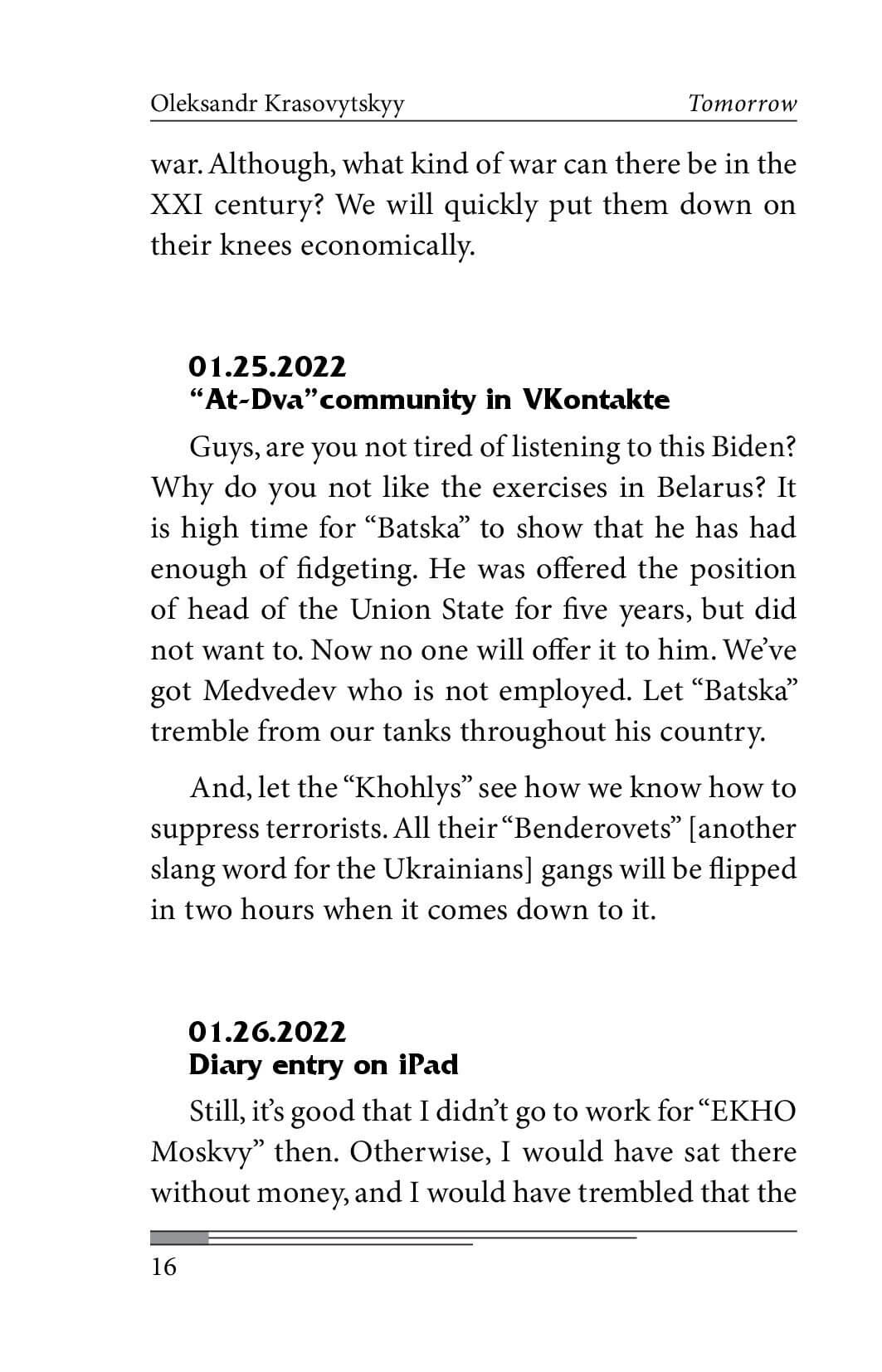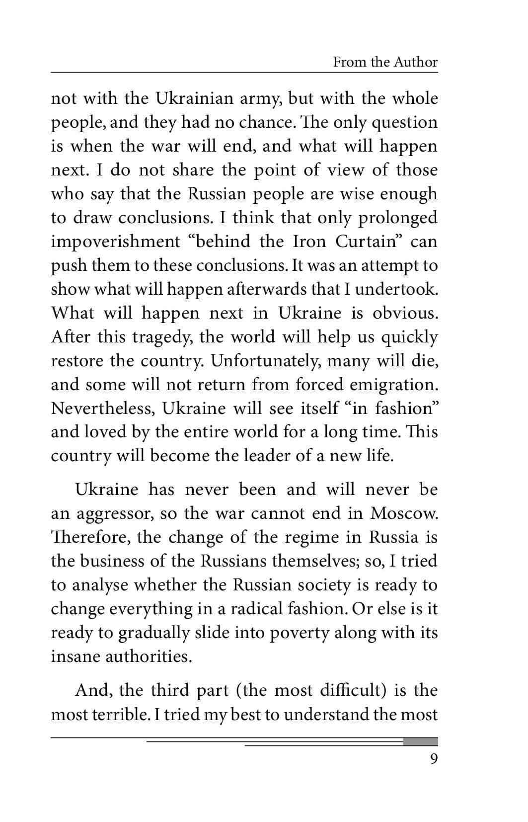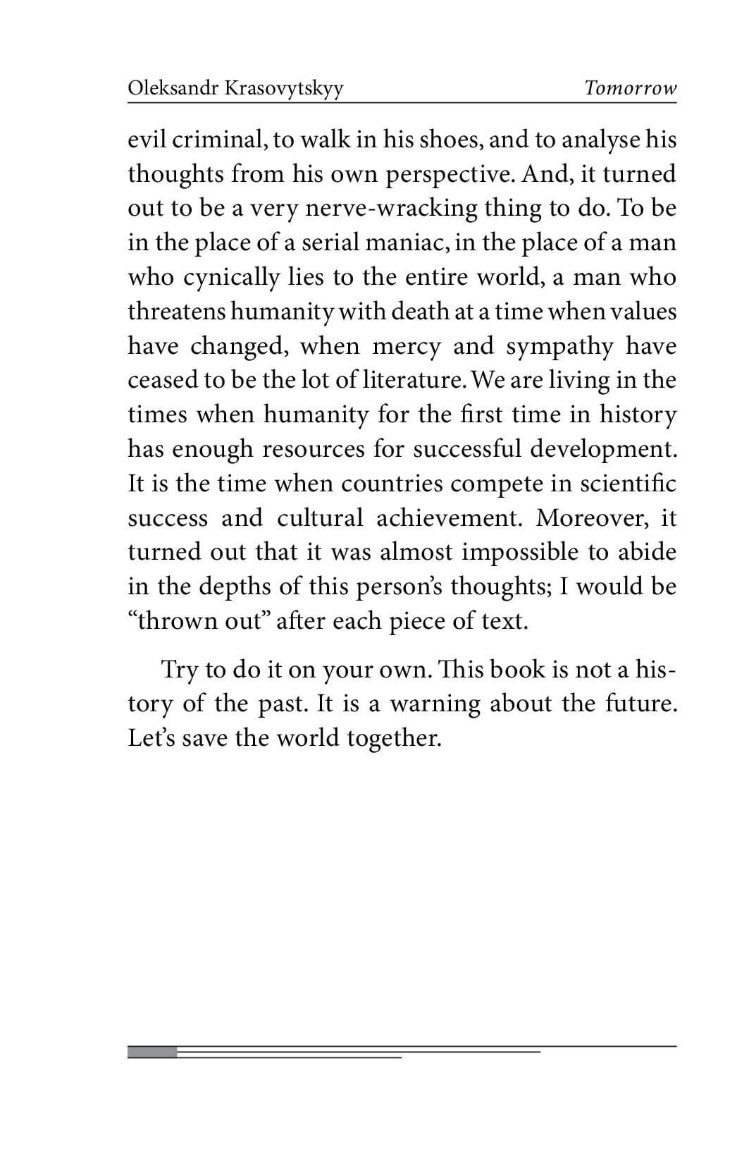The new book Tomorrow by Oleksandr Krasovytskyy is a dazzling prediction of forthcoming and distant events that will inevitably overtake the “evil empire” of the Ru***** Fe****** because of its infernal acts.