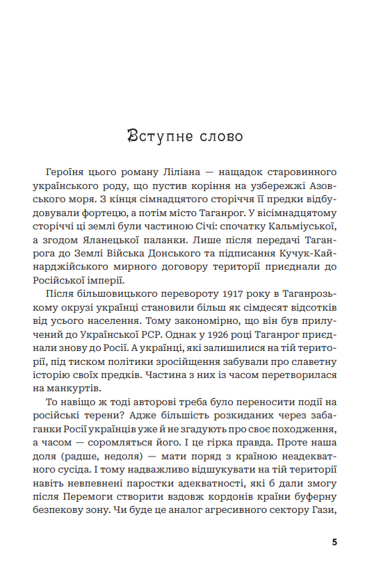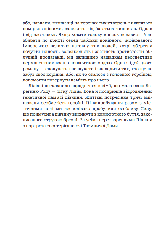 Сюжет роману розгортається на тлі реальних історичних подій останніх десятиліть в умовах спотворення сприйняття дійсності пересічних росіян. Ці руйнівні процеси не оминули й етнічних українців, таких, як родина головної героїні. Ліліані довелося пройти через дитячі страхи, підживлені фантазією, підлітковий булінг, кохання і зраду, перш ніж в ній прокинулася генетична пам’ять. Завдяки їй Ліліана відкриває в собі особливі здібності, що отримала від предків. Переродження дівчини прискорили зловісні дзвінки і таємничі події довкола неї. За її перетвореннями з портрета спостерігали очі Таємничої Дами.