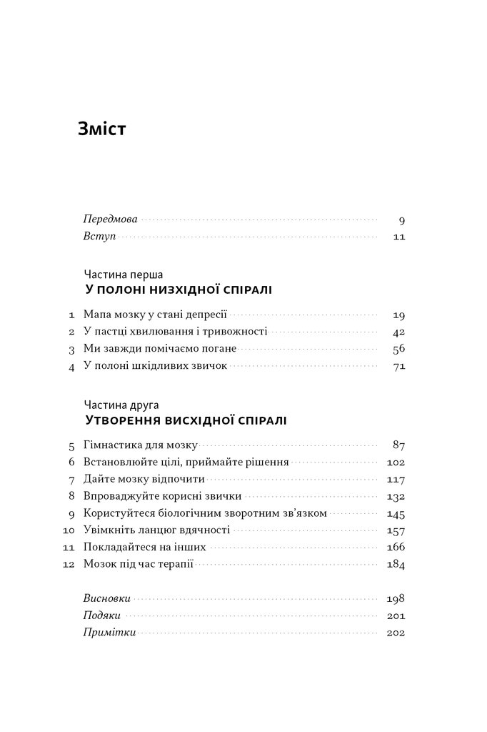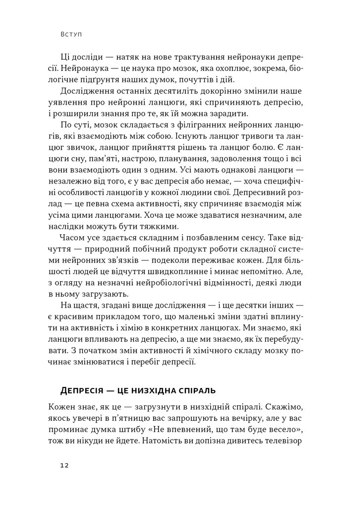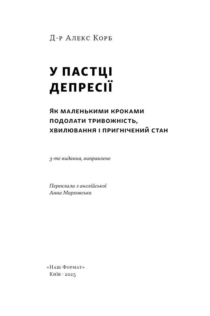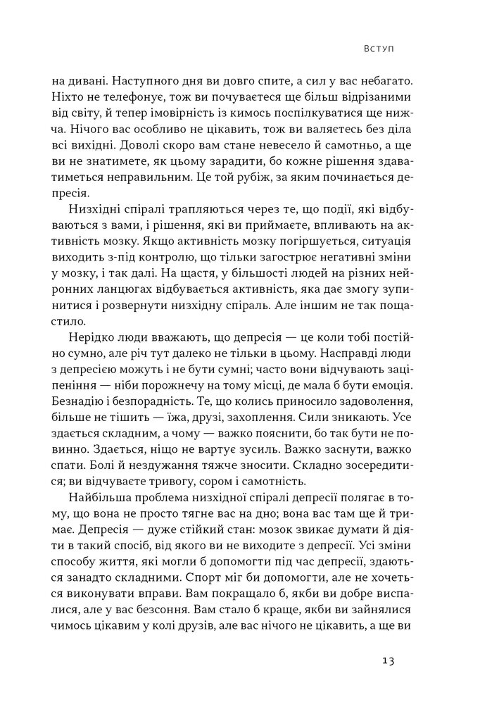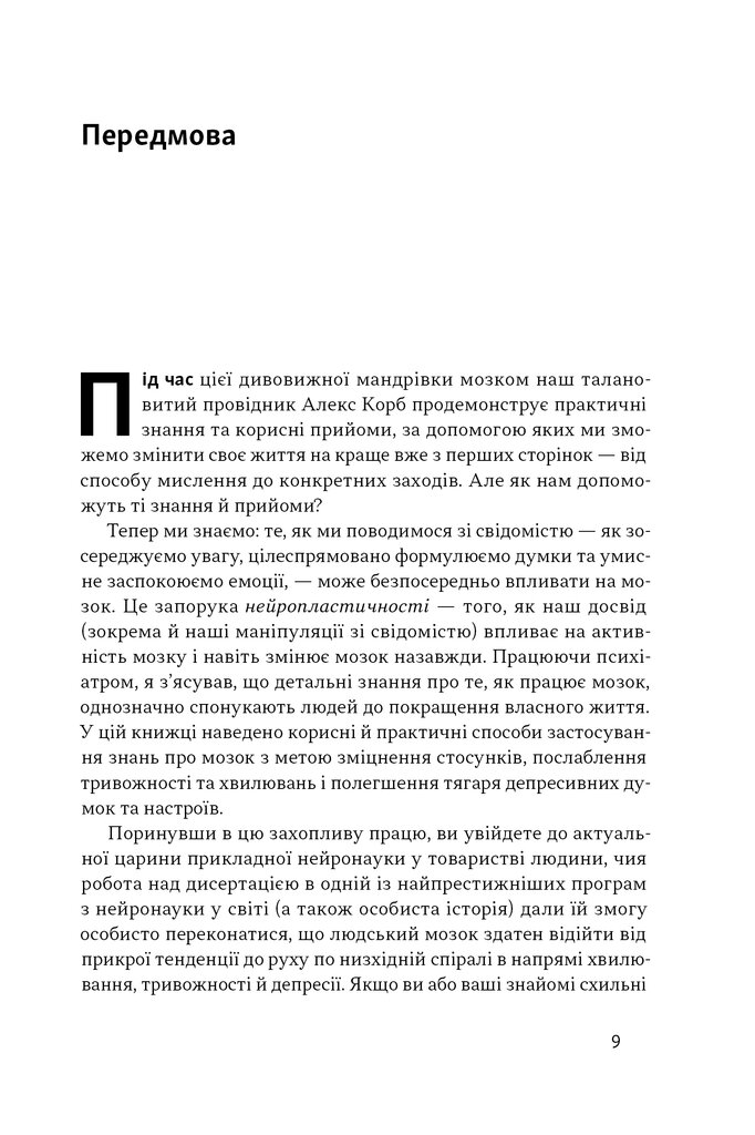 У цій книжці Алекс Корб пояснює, що відбувається в мозку людини у пригніченому стані, які думки ведуть униз та як «перепрошити» деструктивні патерни на підтримувальні. На відміну від типових порадників, книжка спирається на нові нейробіологічні дані, щоб показати: навіть найменші дії — фізична активність, дихання, соціалізація — здатні вплинути на активність різних нейронних ланцюгів і якісно змінити життя.