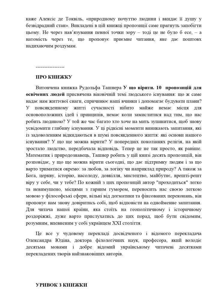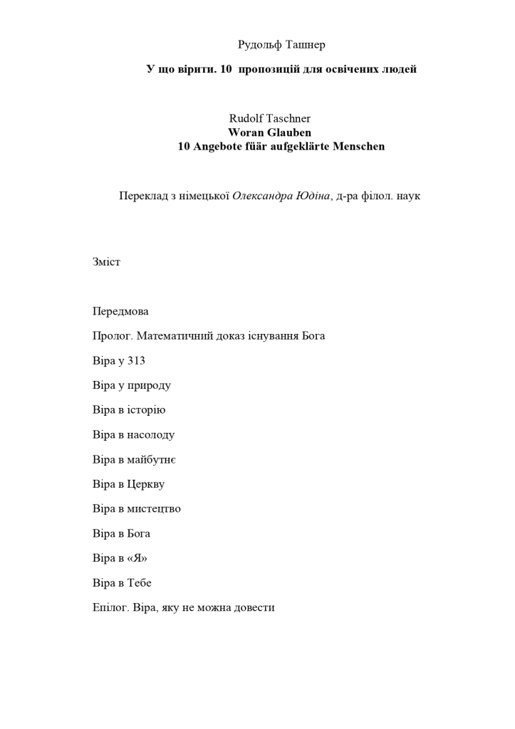 Витончена книжка Рудольфа Ташнера присвячена споконвічній темі людського існування: що надає нам життєвої снаги, обумовлює наші вчинки і допомагає накреслювати плани на майбутнє? Математик і природознавець, людина універсальної ерудиції Рудольф Ташнер надає десять пропозицій: у що ще можна вірити сьогодні, що дає підтримку людям і за що варто триматися чимдуж – за любов, за логіку чи, наприклад, природу. А також за Бога, церкву, історію, насолоду, довкілля, мистецтво, майбутнє, врешті-решт, віру в себе? Кожною з цих пропозицій автор «проходиться» легко та невимушено, доступною мовою, з витонченим гумором відсилає нас у філософські сфери, вільні від догматики та усталених переконань, пропонує інтригуюче бачення і тлумачення історичних фактів і відомих джерел, зокрема, деяких місць Біблії. Читачеві нашої країни, яка стоїть на геополітичному та історичному роздоріжжі, варто дослухатися до цих цінних порад, аби стати свідомим, розумним, впевненим у собі модерним українцем ХХI століття.