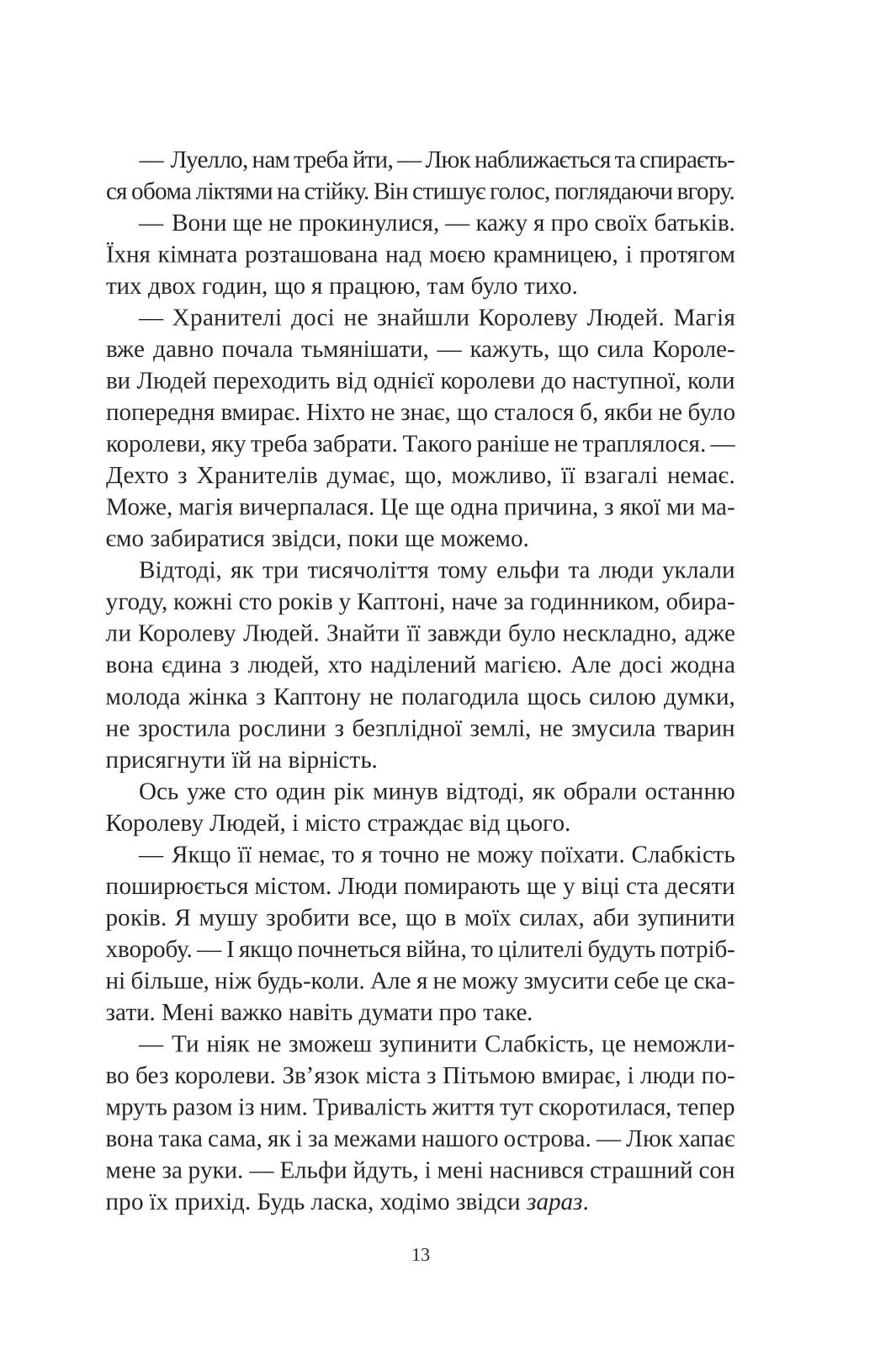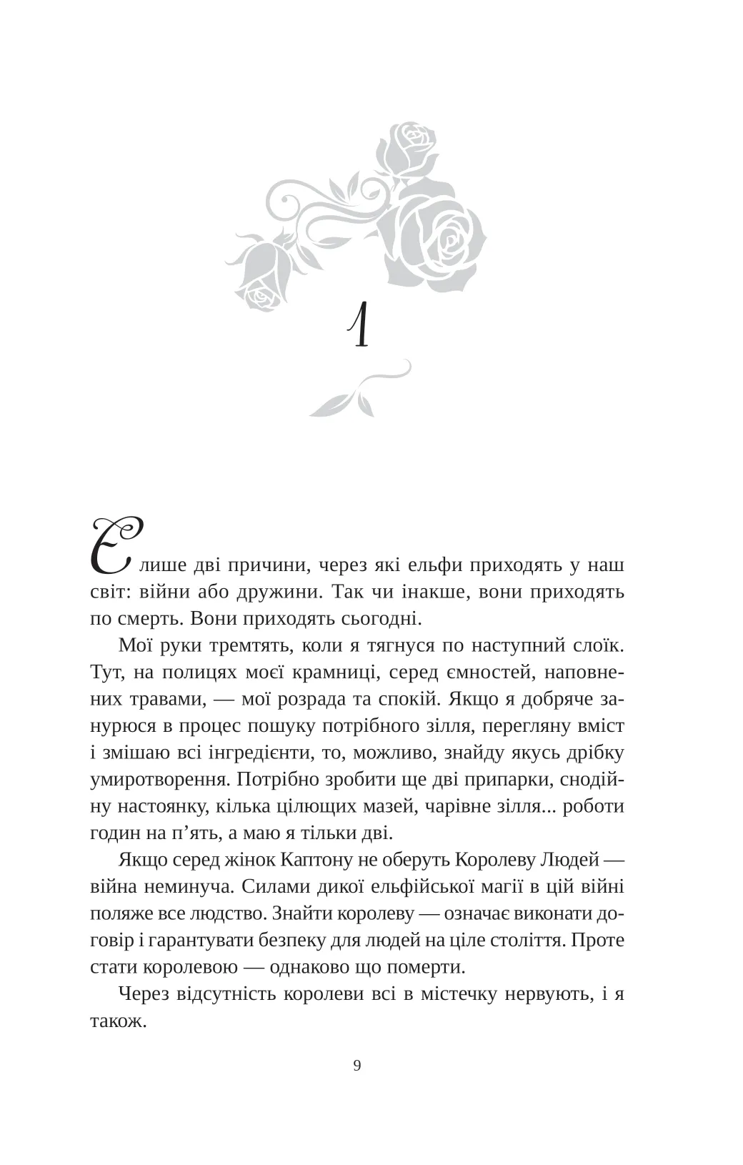 Усе, що дівчина досі знала про своє життя, виявляється брехнею. У чужому світі, сповненому дикої магії, вона змушена стати дружиною холодного й замкнутого Короля Ельфів. Тому що магічна земля поволі помирає, а порятунок залежить від Королеви. Та справжнім випробуванням для Луелли стане пристрасть, якої вона ніколи не бажала.