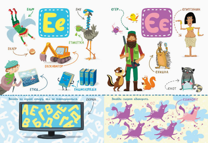 На кожній сторінці багато предметів на певну літеру, а також завдання для кращого засвоєння абетки.