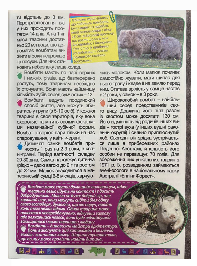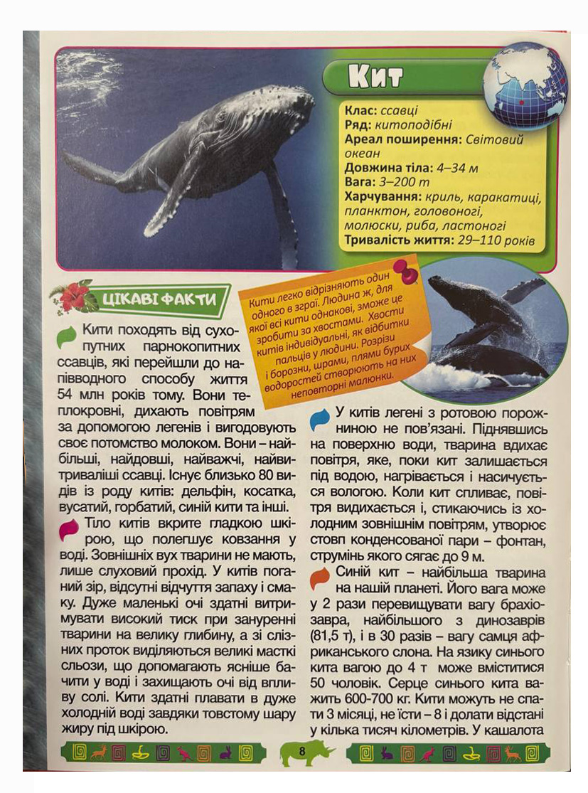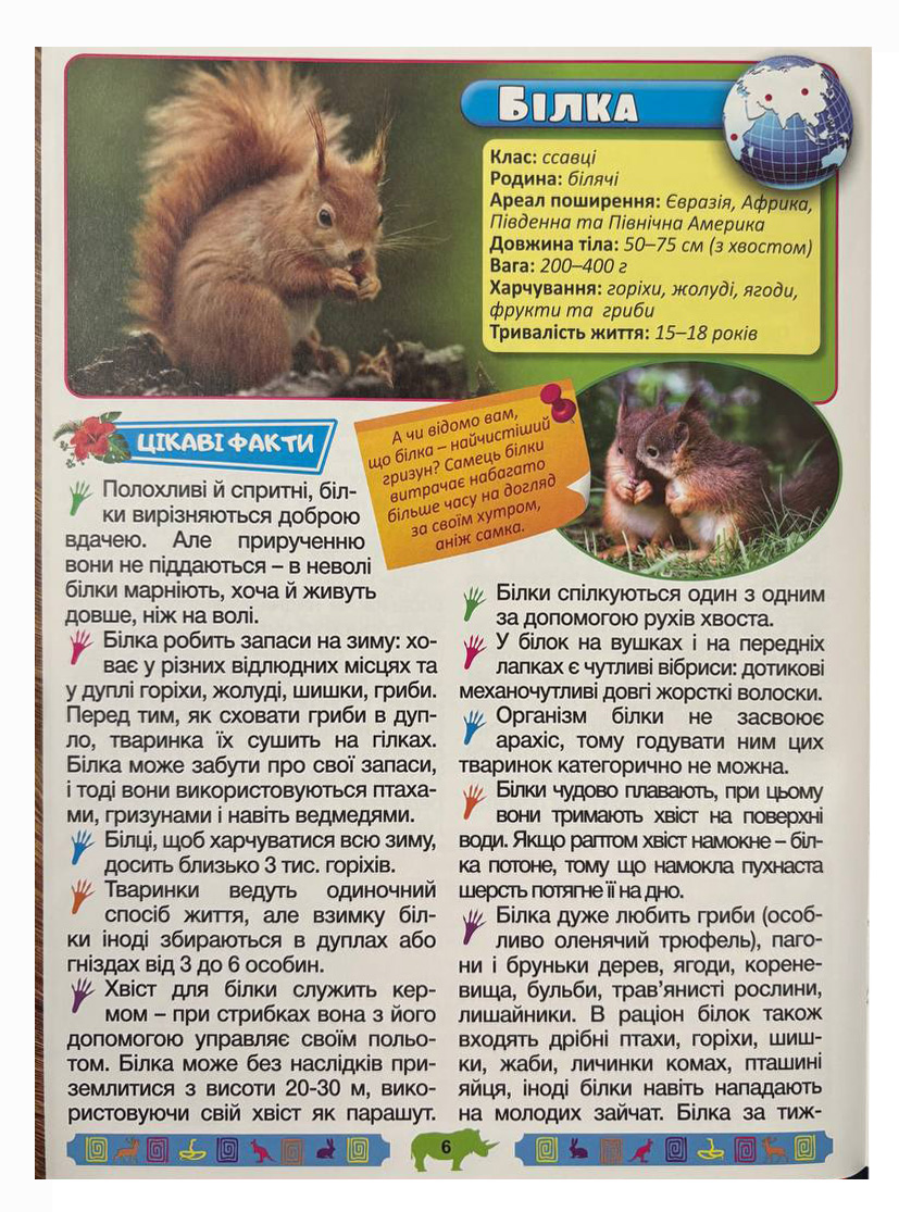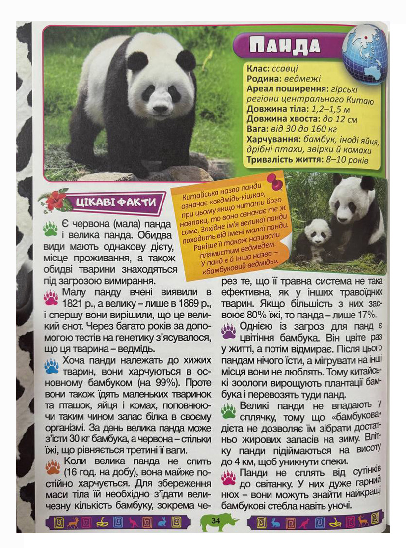 Ця чудова книга познайомить вашу дитину з дивовижним світом тварин: дикими і домашніми, птахами й рептиліями, жителями різних континентів, морів і океанів. Пізнавальні тексти, незвичайні факти, яскраві фотографії допоможуть юному досліднику дізнатися багато цікавого і корисного про звички тварин, середовище проживання, харчування, особливості виховання дитинчат і багато іншого. На сторінках видання ваша дитина зустрінеться з найбільшими і найменшими, найшвидшими і небезпечними, привітними і незвичайними тваринами нашої планети. Книга стане справжнім подарунком для допитливої дитини.