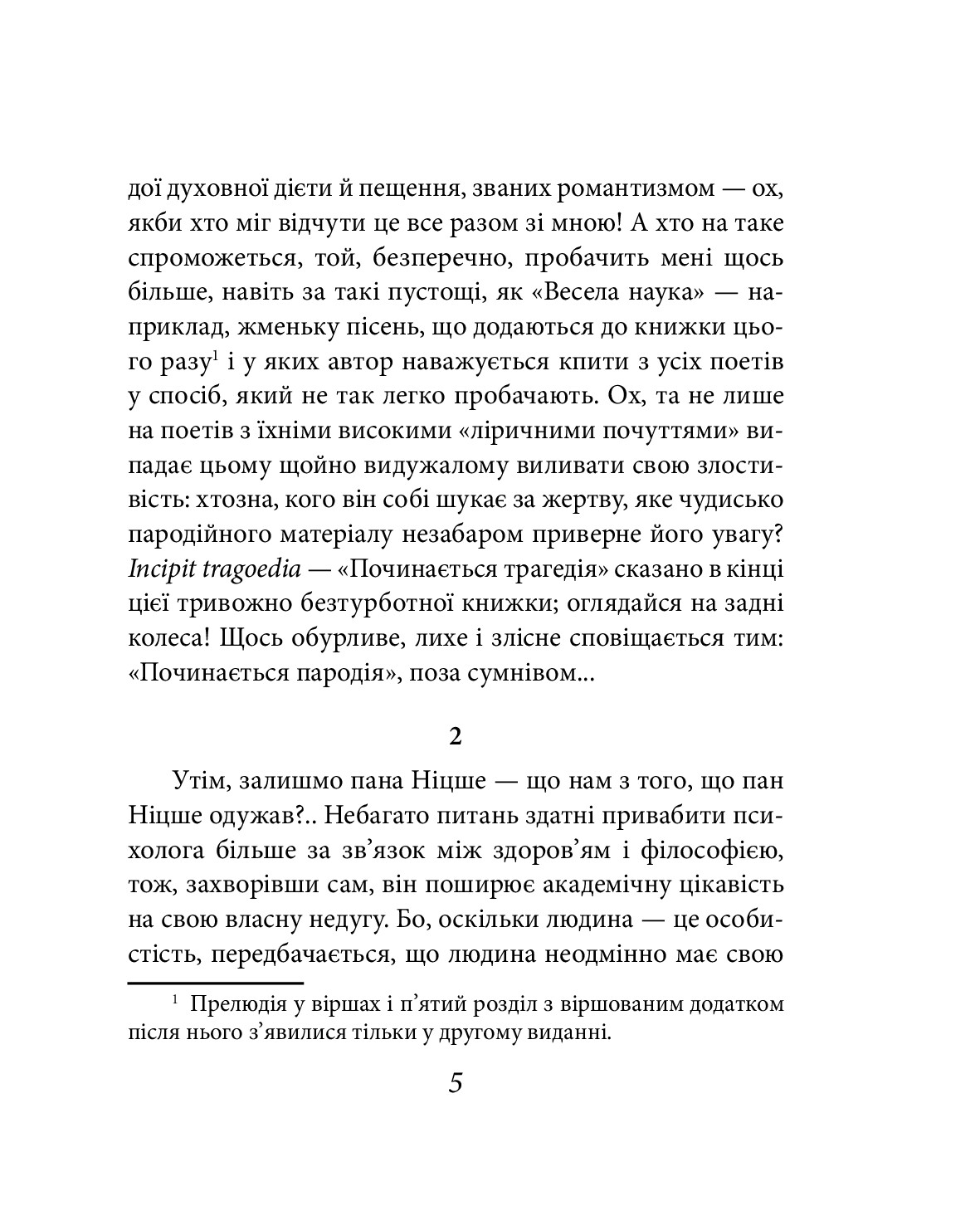 Твори видатного німецького філософа Фрідріха Ніцше (1844–1900) мали вибуховий ефект і чи не найбільше цитувалися у ХХ столітті. Бунтівна натура мислителя не дала йому довго зачаровуватися ідеалізмом, як не спокусив його й матеріалізм. Ніцше знайшов свій особистий шлях — він називав себе філософом неприємних істин. Вінцем його філософії стала «книга для усіх і ні для кого» — «Так мовив Заратустра». А «Веселу науку» Ніцше пізніше називав коментарем до «Заратустри». Неабиякий літературний хист мислителя зробив його творчість надбанням не тільки філософії, а й літератури.
