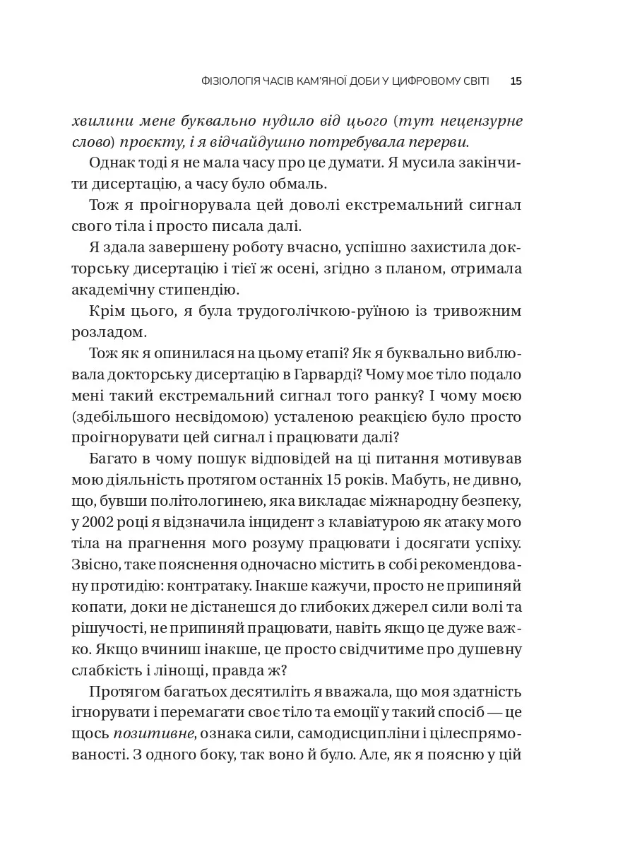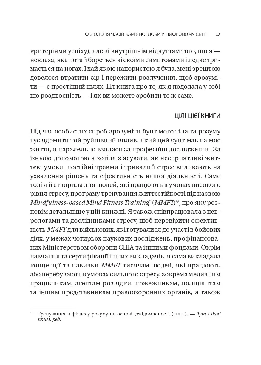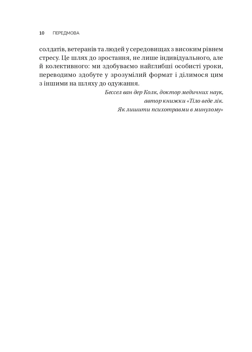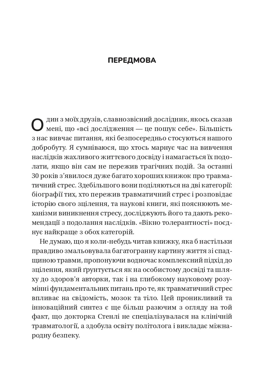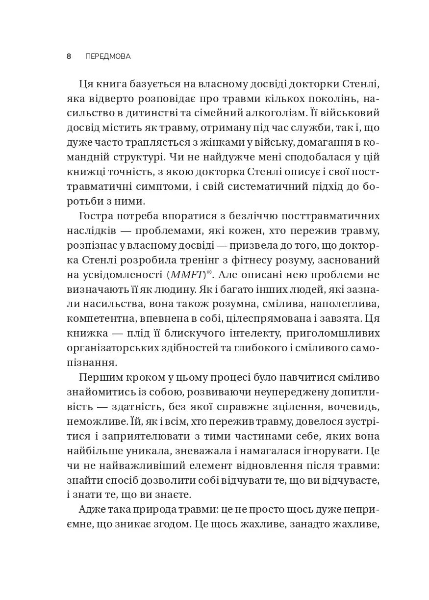 Травми змінюють наше світосприйняття. Сама травматична подія зостається в минулому, а посттравматичні реакції позбавляють нас повноцінного життя сьогодні. Травматичний досвід зберігається поза нашою свідомістю й проявляється у фізичних симптомах і саморуйнівних діях. Книжка Елізабет Стенлі — ключ до усвідомленості, а відтак і зцілення. Авторка досліджує культурні норми, які перешкоджають життєстійкості, зокрема колективну тенденцію відокремлювати стрес від його наслідків і нехтувати потребою у відновленні. Особистий досвід дозволив Елізабет Стенлі розробити інноваційний підхід до одужання від стресу та травм, щоб дати цивільним і військовим інструменти для покращення саморегуляції та психологічної стійкості.