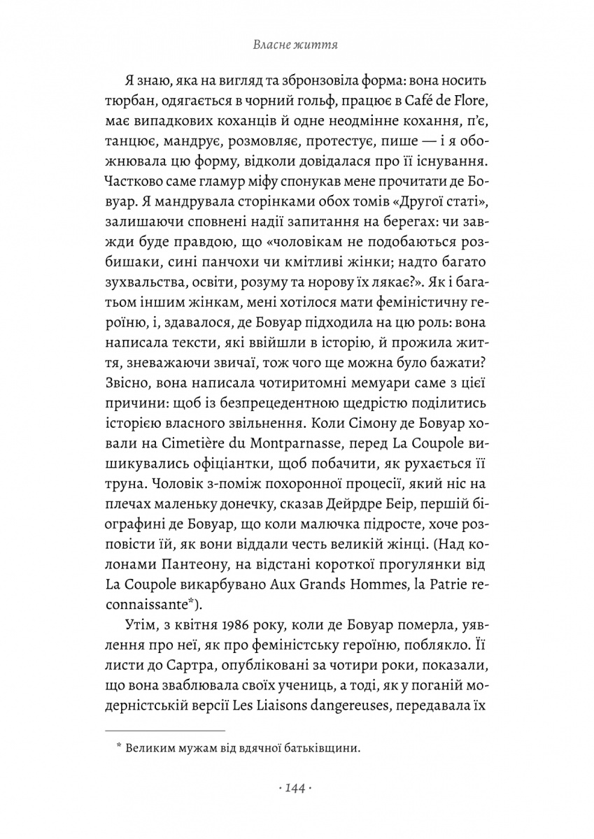 «Власне життя» поєднує мемуари й літературну критику, досліджує постаті видатних письменниць, знімає їх із п'єдесталів і розглядає під новим, неочікуваним кутом. Що давало жінкам силу писати? Чого ми можемо в них навчитися? Чи є домашнє життя для жінки пасткою? Чи існують у шлюбі «жіночі» й «чоловічі» ролі? І чому жінкам так важливо читати жінок?