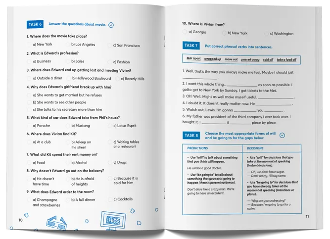 Зошит поділено на 2 частини: перша-для опрацювання фільму до початку перегляду, друга-після перегляду. У двох розділах ти зможеш працювати над трьома типами завдань: Vocabulary/Plot/Grammar.