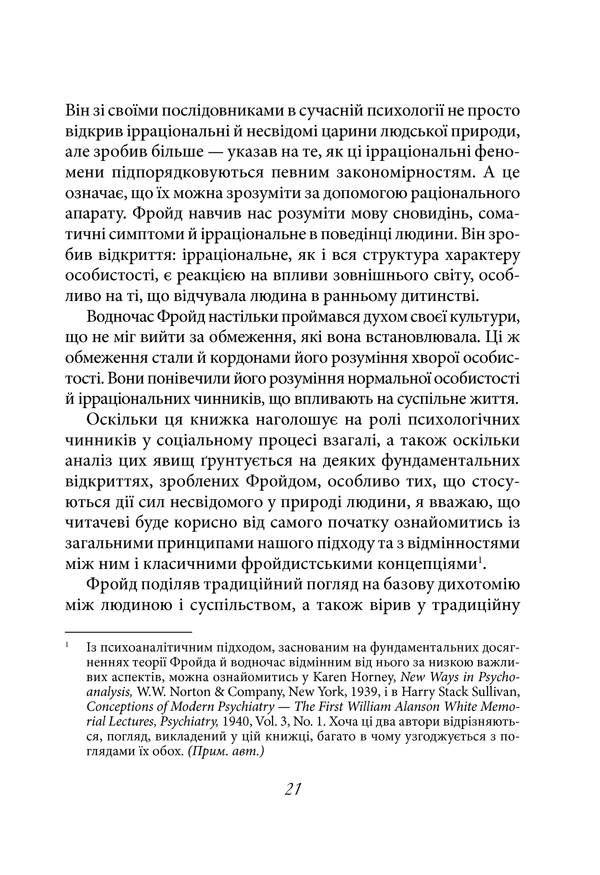 Основоположник психоаналізу Зиґмунд Фройд говорив: «Більшість людей насправді не хочуть свободи, тому що вона передбачає відповідальність, а відповідальність лякає людей». Може, тому втеча від свободи цілком прийнятна для більшості? Еріх Фромм розкриває перед читачем саму суть свободи, чим вона є для сучасної особистості. Чи існує зв’язок між авторитарними режимами та втечею від свободи? Як пояснити той факт, що деякі люди добровільно відмовляються від незалежності, віддаючи перевагу рабству й обираючи конформізм? Чому свобода може спричиняти почуття самотності, страху та безсилля? І чи справді свобода має дві форми — хорошу й погану? Еріх Фромм розглядає феномен свободи і відповідає на ці одвічні питання.