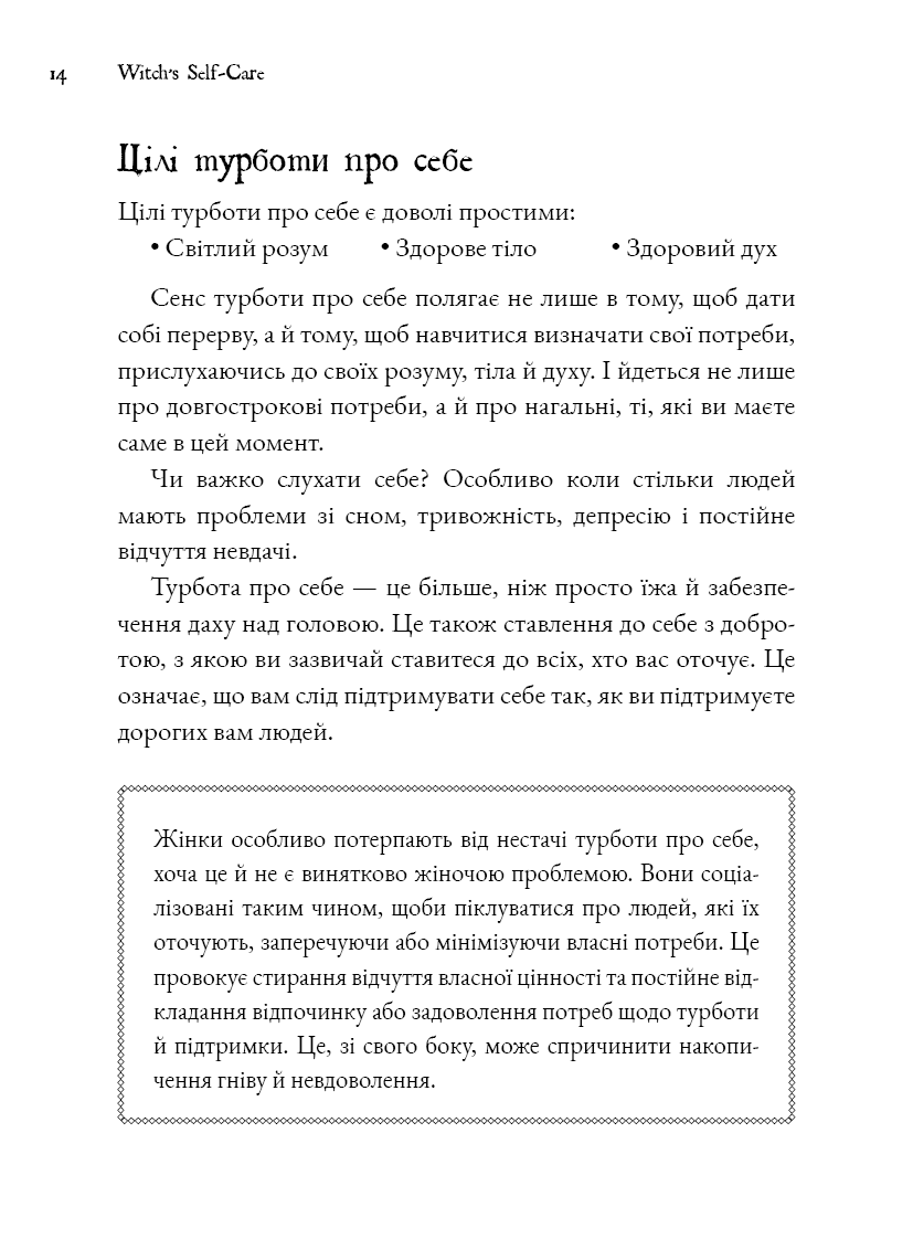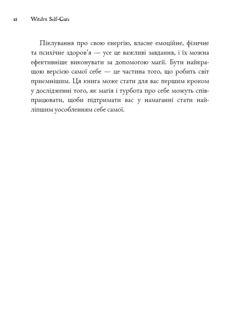Турбота про себе — це необхідна частина життя будь-якої сучасної жінки. Цілі турботи про себе водночас прості й важливі: здоровий дух і здорове тіло. Ця книга допоможе читачкам розставити пріоритети в рутинному життя за допомогою простої і зрозумілої магії. Книга «Witch's Self-Care» містить поради, які дадуть змогу підтримати, заспокоїти та врівноважити розум, тіло й дух за допомогою заклинань, медитацій, мантр і вправ.