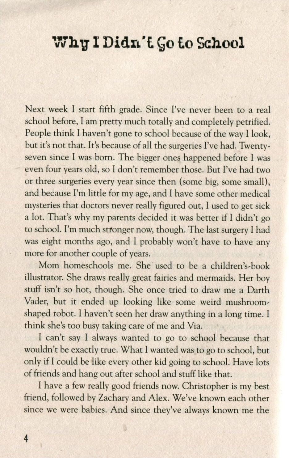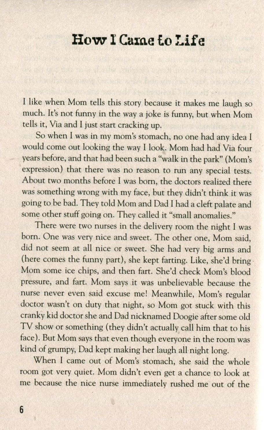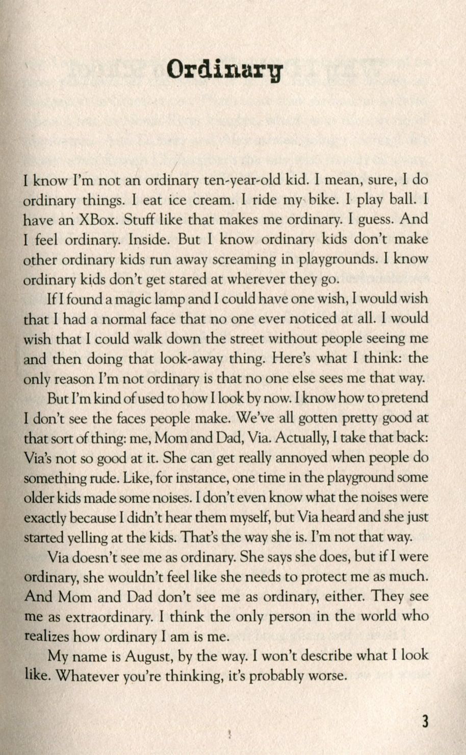 'My name is August. I won't describe what I look like. Whatever you're thinking, it's probably worse.' Auggie wants to be an ordinary ten-year-old. He does ordinary things - eating ice cream, playing on his Xbox. He feels ordinary - inside. But ordinary kids don't make other ordinary kids run away screaming in playgrounds. Ordinary kids aren't stared at wherever they go. Born with a terrible facial abnormality, Auggie has been home-schooled by his parents his whole life. Now, for the first time, he's being sent to a real school - and he's dreading it. All he wants is to be accepted - but can he convince his new classmates that he's just like them, underneath it all? Wonder is a funny, frank, astonishingly moving debut to read in one sitting, pass on to others, and remember long after the final page.