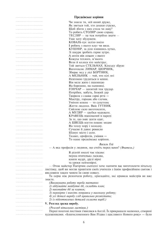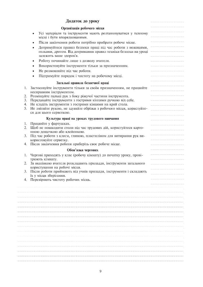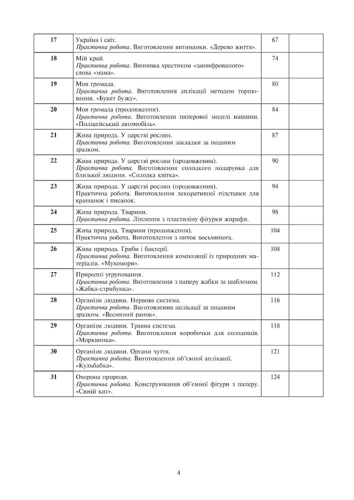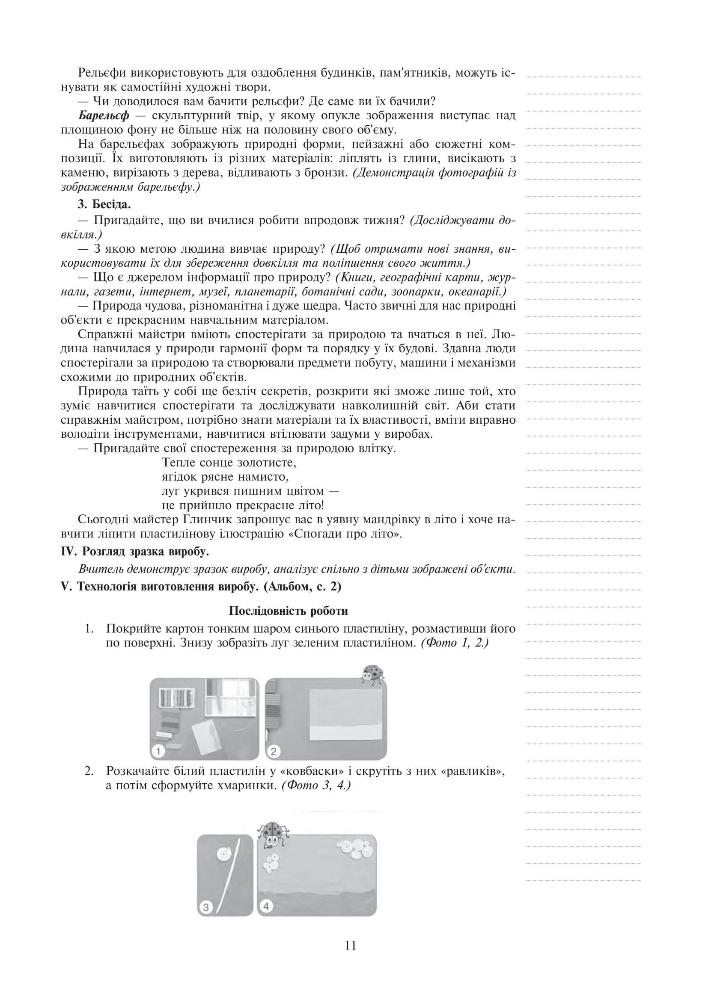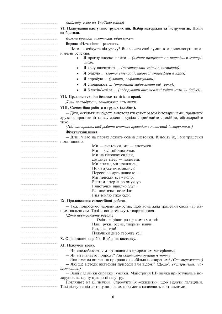 Запропоновано систему запитань, завдань для індивідуальної та групової роботи, практичні роботи, тренувальні вправи, репродуктивні трудові завдання, зразки бесід під час вивчення нового матеріалу, завдання логічного характеру. Для вчителів початкових класів, студентів педагогічних навчальних закладів.