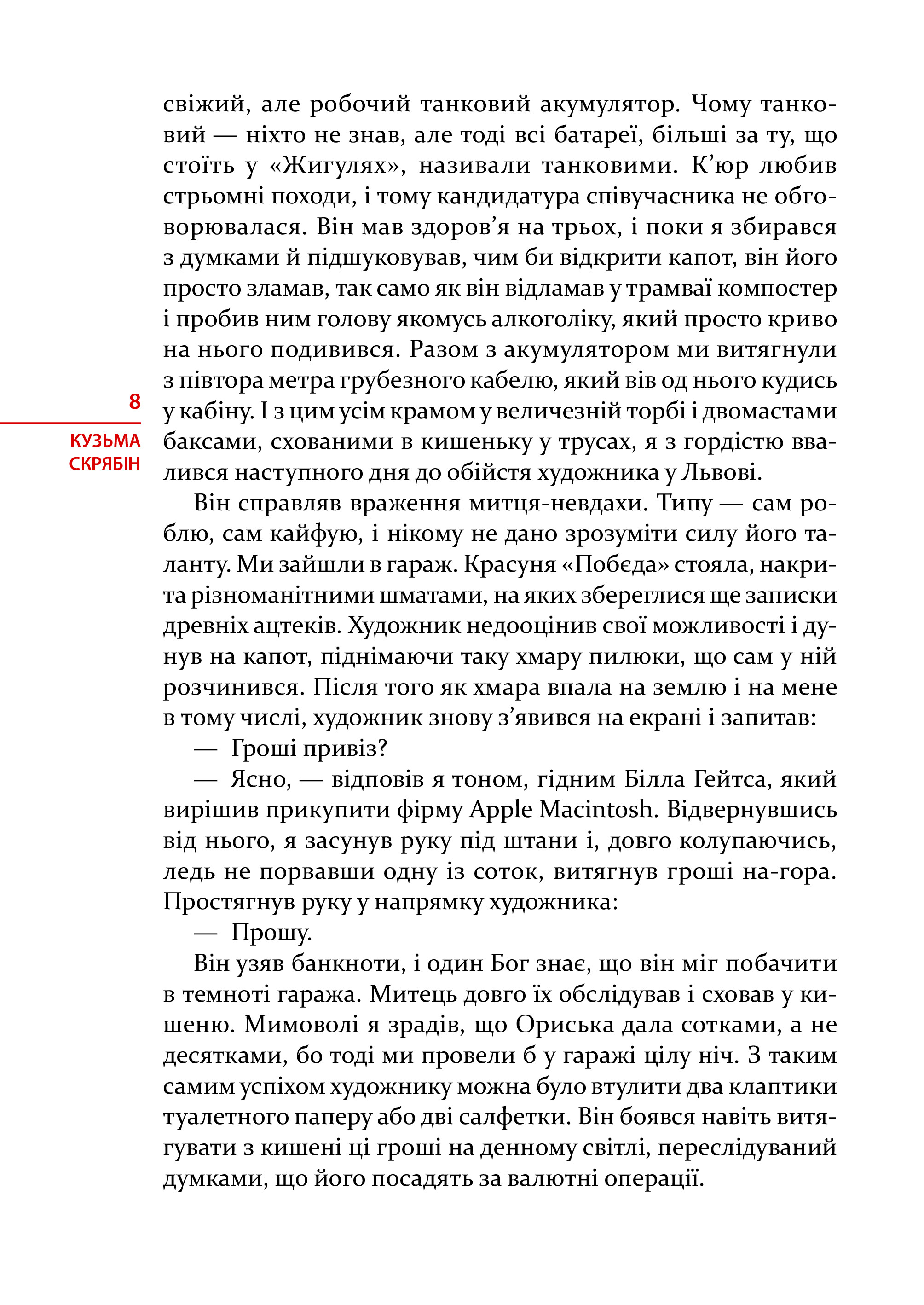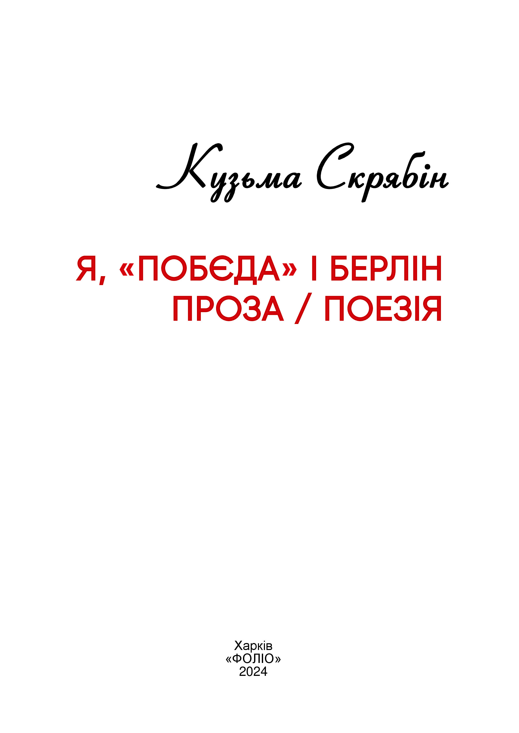 Кузьма Скрябін (справжнє ім’я Андрій Кузьменко; 1968—2015) став легендою ще за життя. «Можливо, треба було жити, як всі, а я хотівбути інакшим завжди», — говорив він і таким був. Доля відміряла йому надто мало часу, він трагічно загинув у ДТП. Харизматичний співак, композитор, багаторічний лідер гурту «Скрябін», автор власних пісень, кумир мільйонів українців, Кузьма запам’ятався своїм шанувальникам неймовірним гумором, чіткою громадянською позицією та відкритим серцем... Його пісні актуальні сьогодні як ніколи. Хоча Кузьма більш відомий як музикант, він також є автором чотирьох повістей, які ввійшли до цієї книжки разом з віршами. Опублікована у 2006 році й найвідоміша з них — «Я, «Побєда» і Берлін» — була успішно екранізована. Це смішні й сумні, вигадані й автобіографічні історії, в яких Кузьма розповідає про себе, про нас, про життя і як у ньому не втратити здорового глузду. Видання проілюстроване українським художником Олександром Греховим