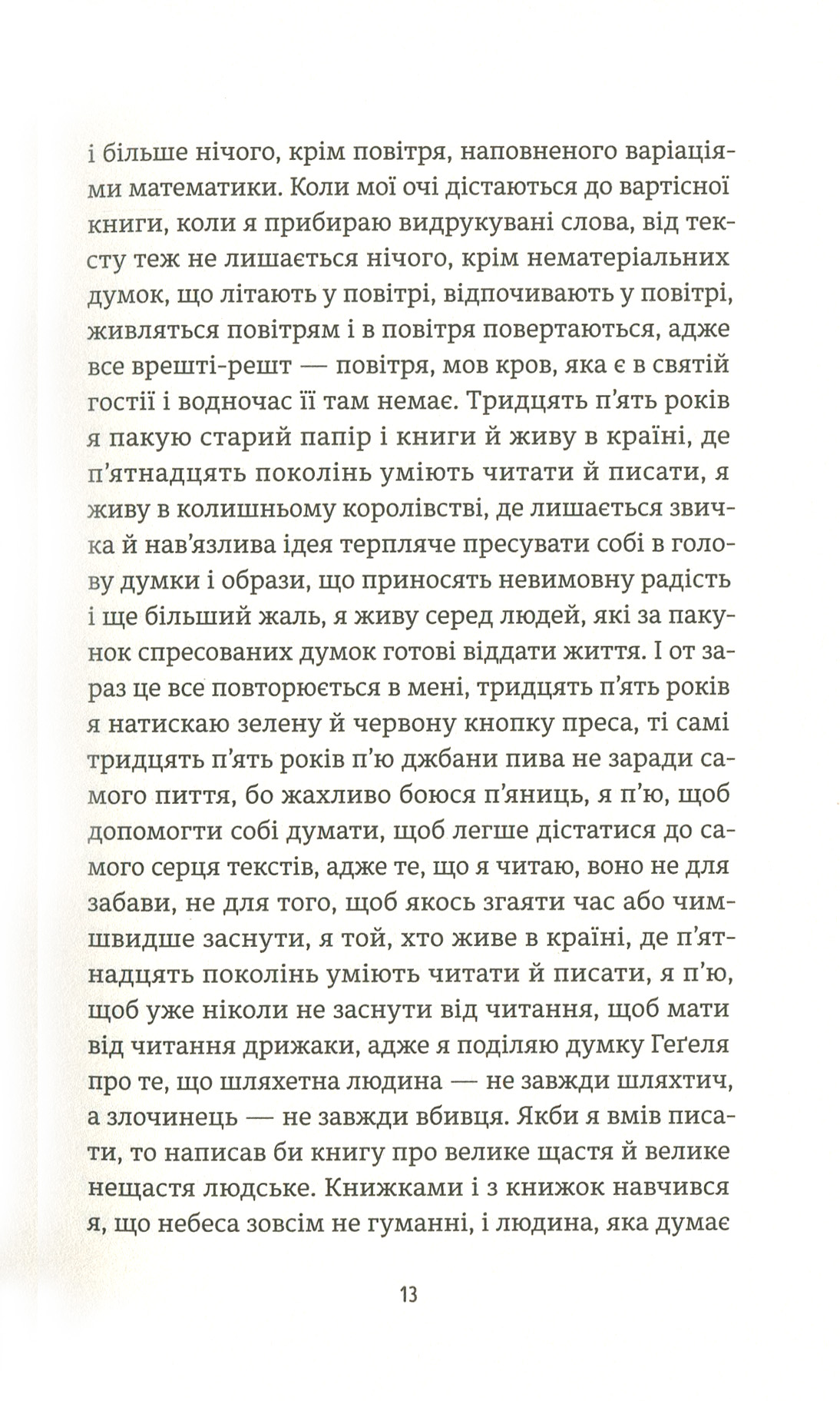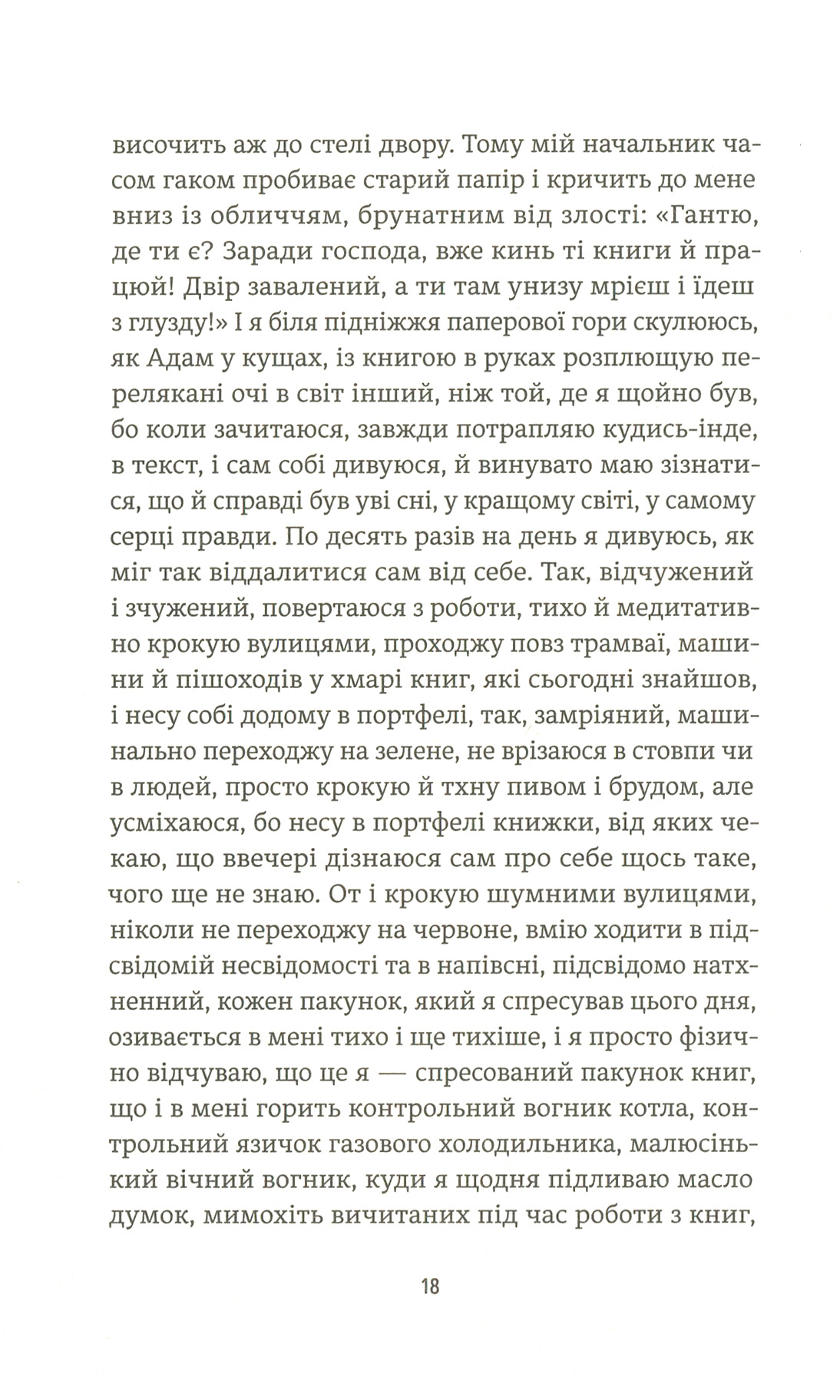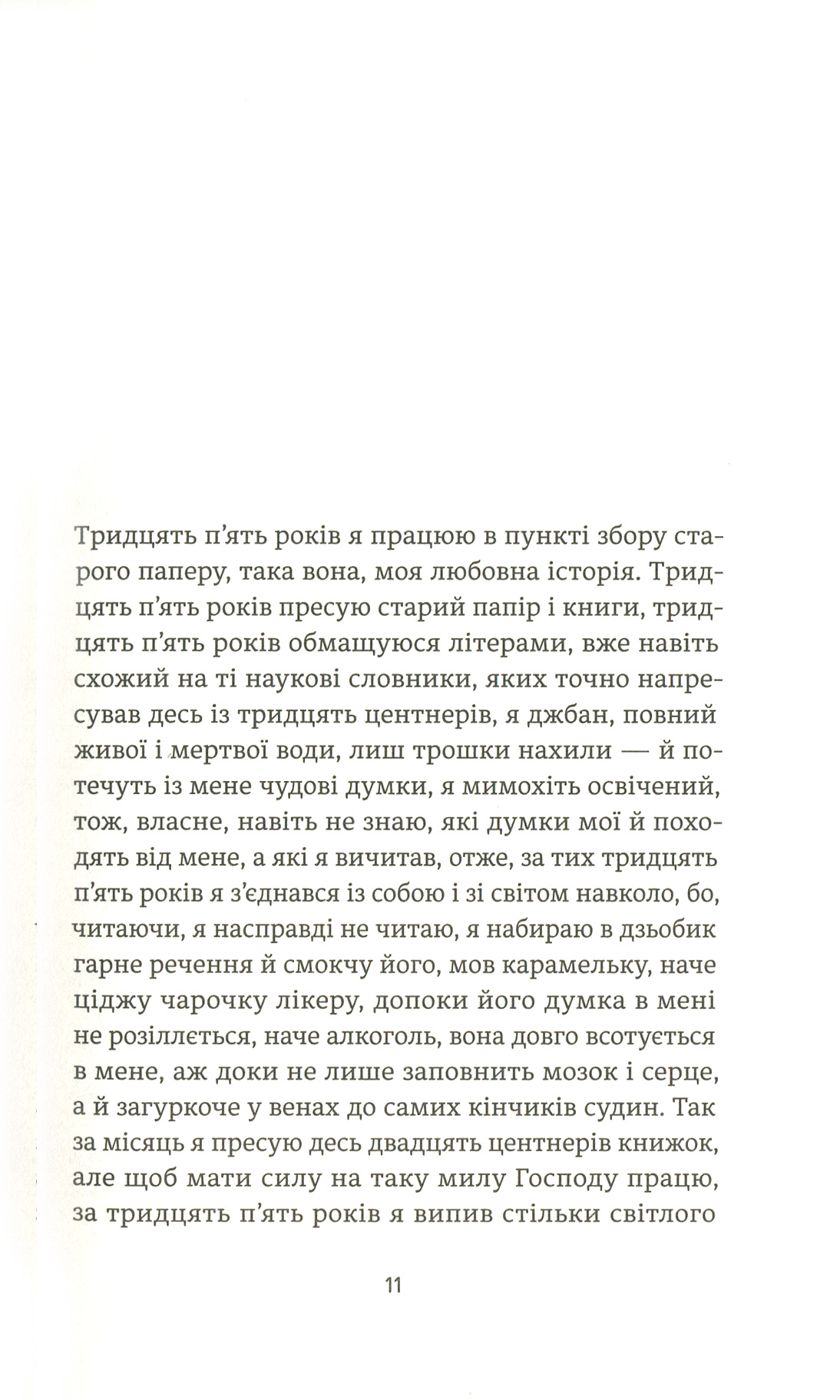 За ці тридцять п’ять років він наносив дві тонни книг і мимохіть здобув освіту, тож вже й не знає, які думки його власні, а які він запозичив у Лао-цзи чи Канта, Шопенгауера чи Геґеля.
