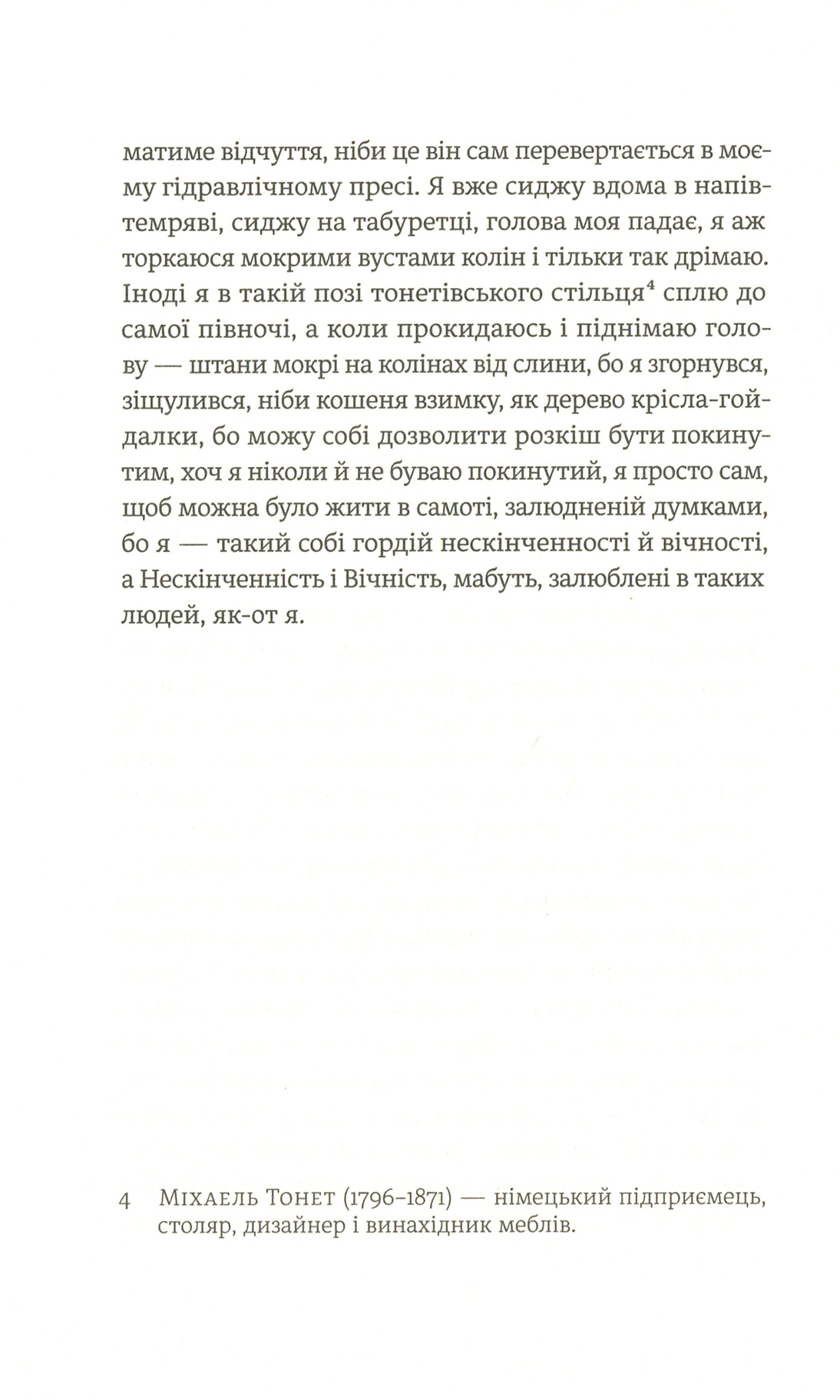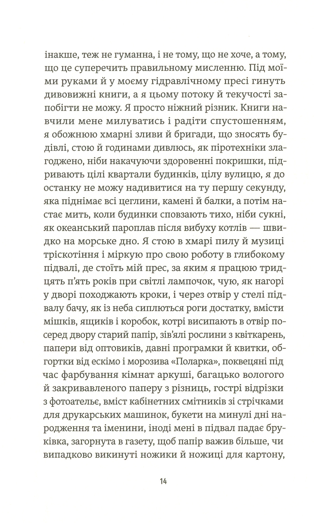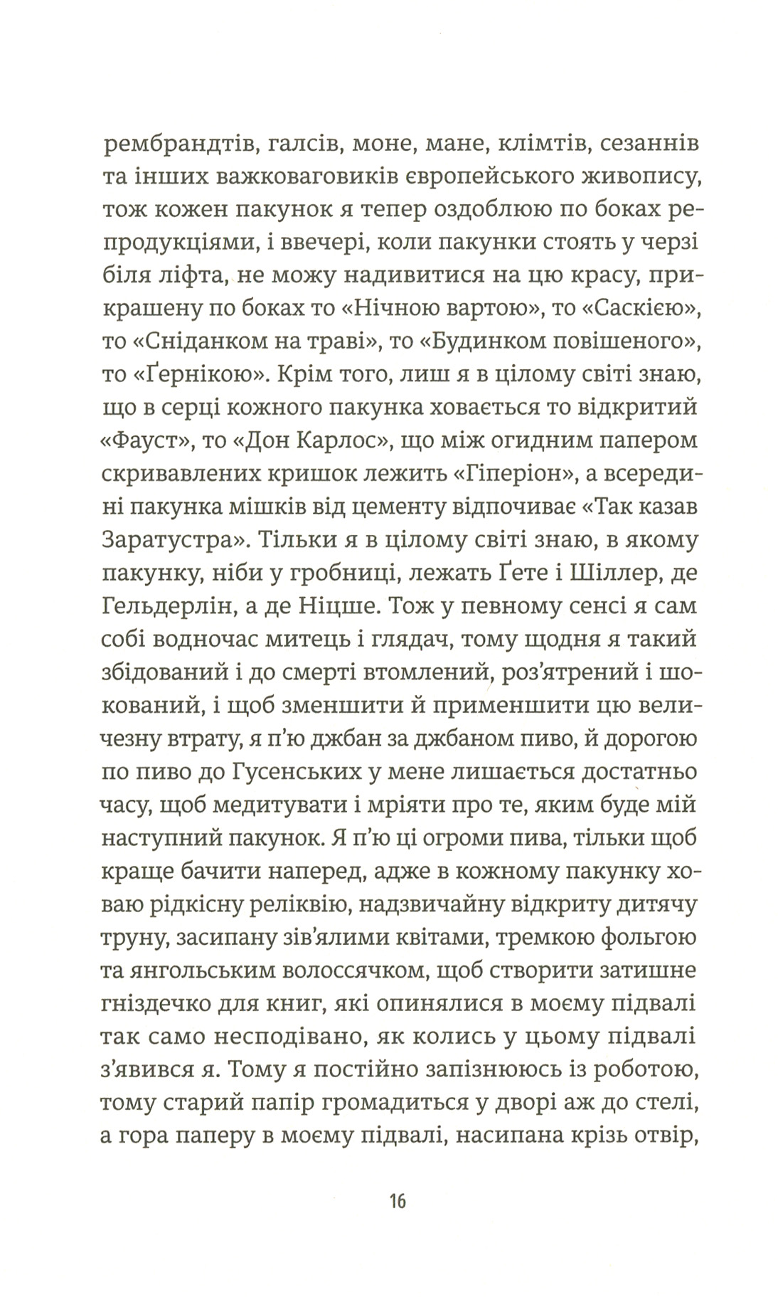 За ці тридцять п’ять років він наносив дві тонни книг і мимохіть здобув освіту, тож вже й не знає, які думки його власні, а які він запозичив у Лао-цзи чи Канта, Шопенгауера чи Геґеля.
