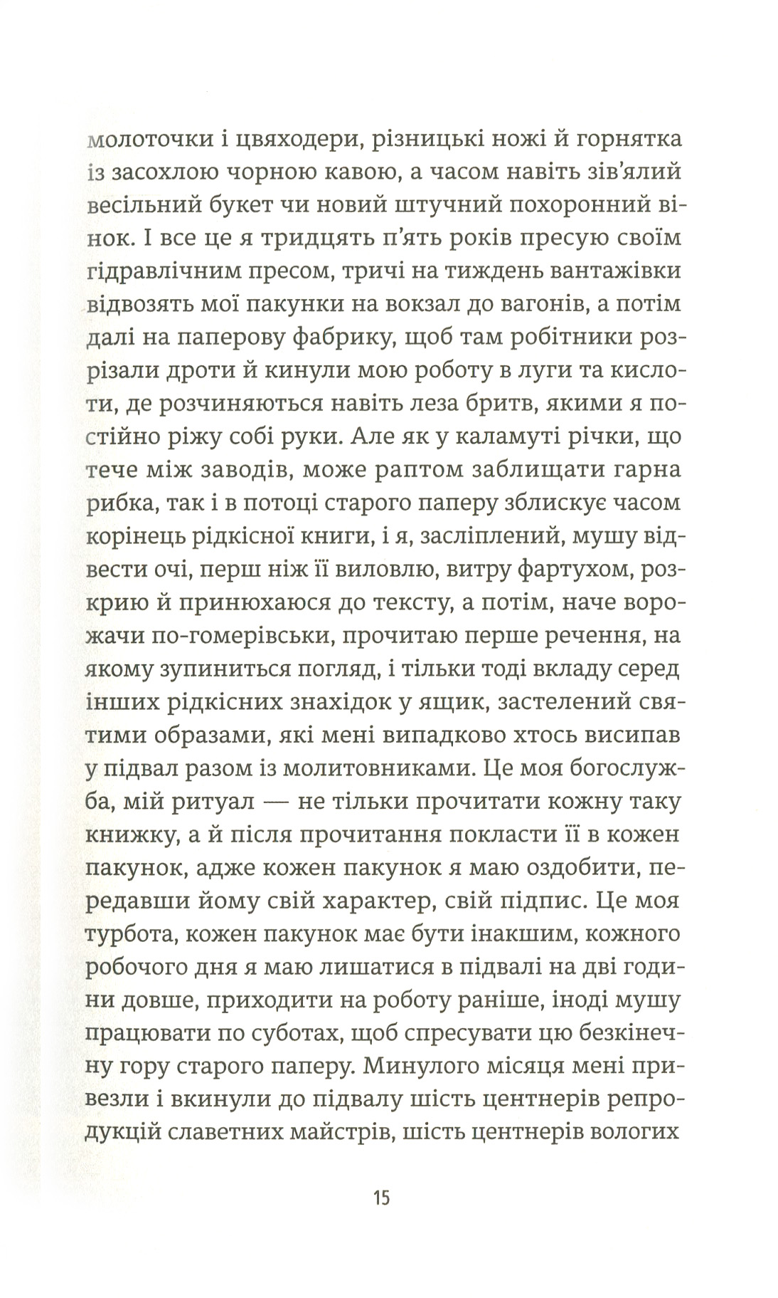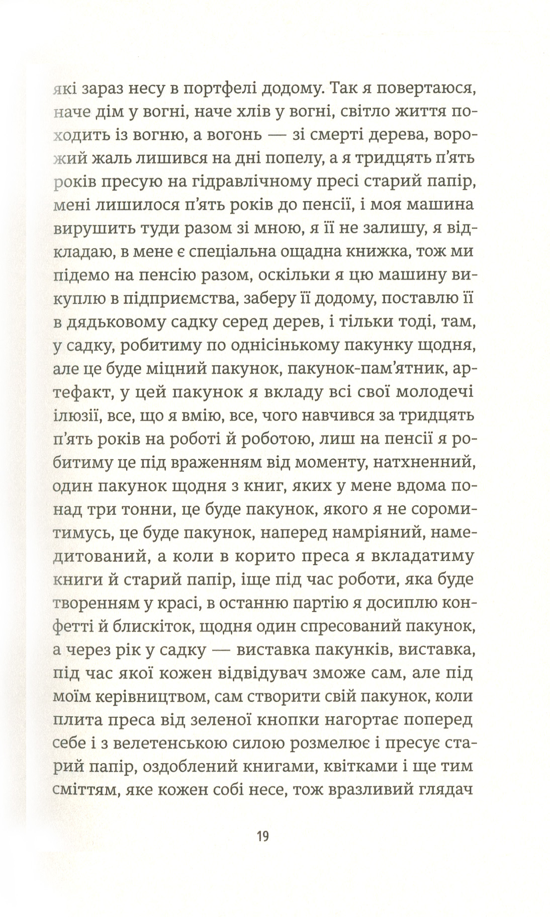 Тридцять п’ять років Гантя працює в пункті збору старого паперу. Кожного вечора рятує з щелеп свого гідравлічного преса книги, несе їх додому і наповнює ними свій будинок.