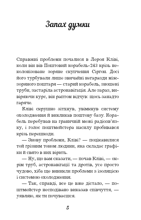 У творі «Запах думки» читач знайомиться із міжгалактичним листоношею Лероєм Кліві. Герой потрапляє на дивну планету, де істоти живуть, спираючись на телекінез. Лерою необхідно навчитися контролювати свої думки, щоб залишатися в безпеці. Який вихід знайде Кліві – читачі дізнаються у фіналі оповідання.