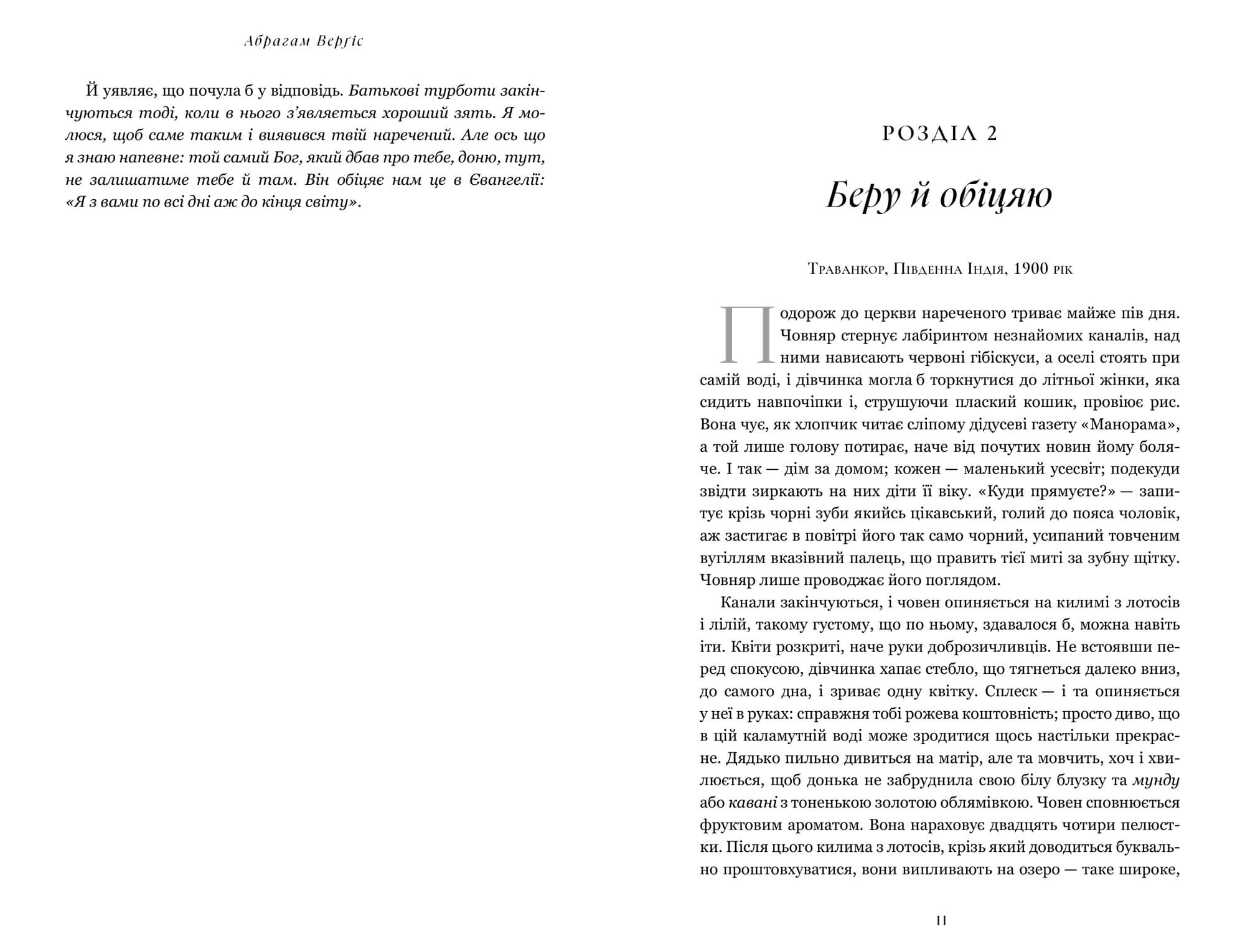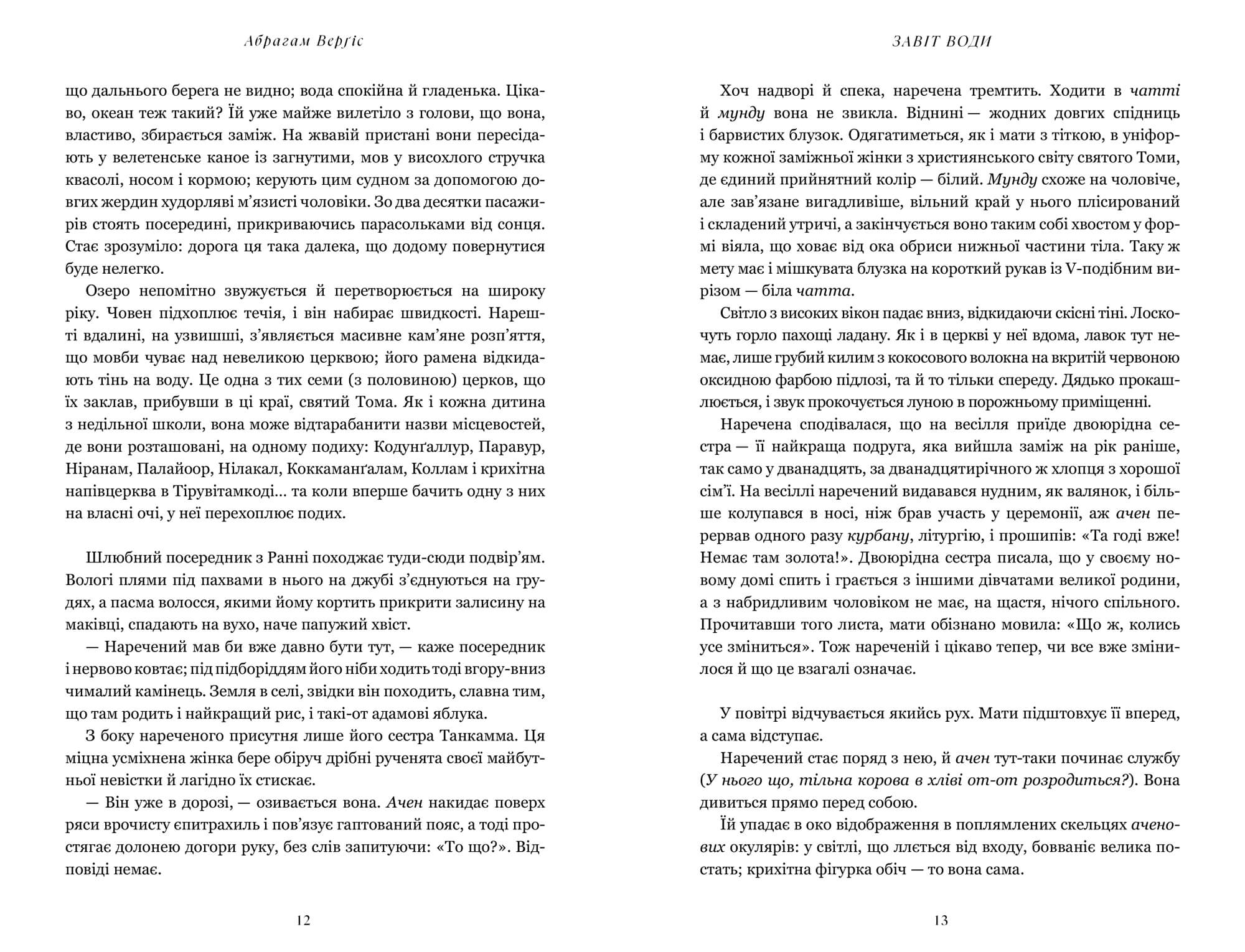 «Завіт води» Абрагама Верґіса — приголомшливий, захопливий роман про три покоління християнської родини в Кералі, Південна Індія, що потерпає від дивного прокляття: щонайменше одна людина в кожному поколінні гине, потонувши. Історія цієї сім’ї химерно пов’язана з історією лікаря-шотландця родом із Ґлазґо, якого доля занесла до Індії.