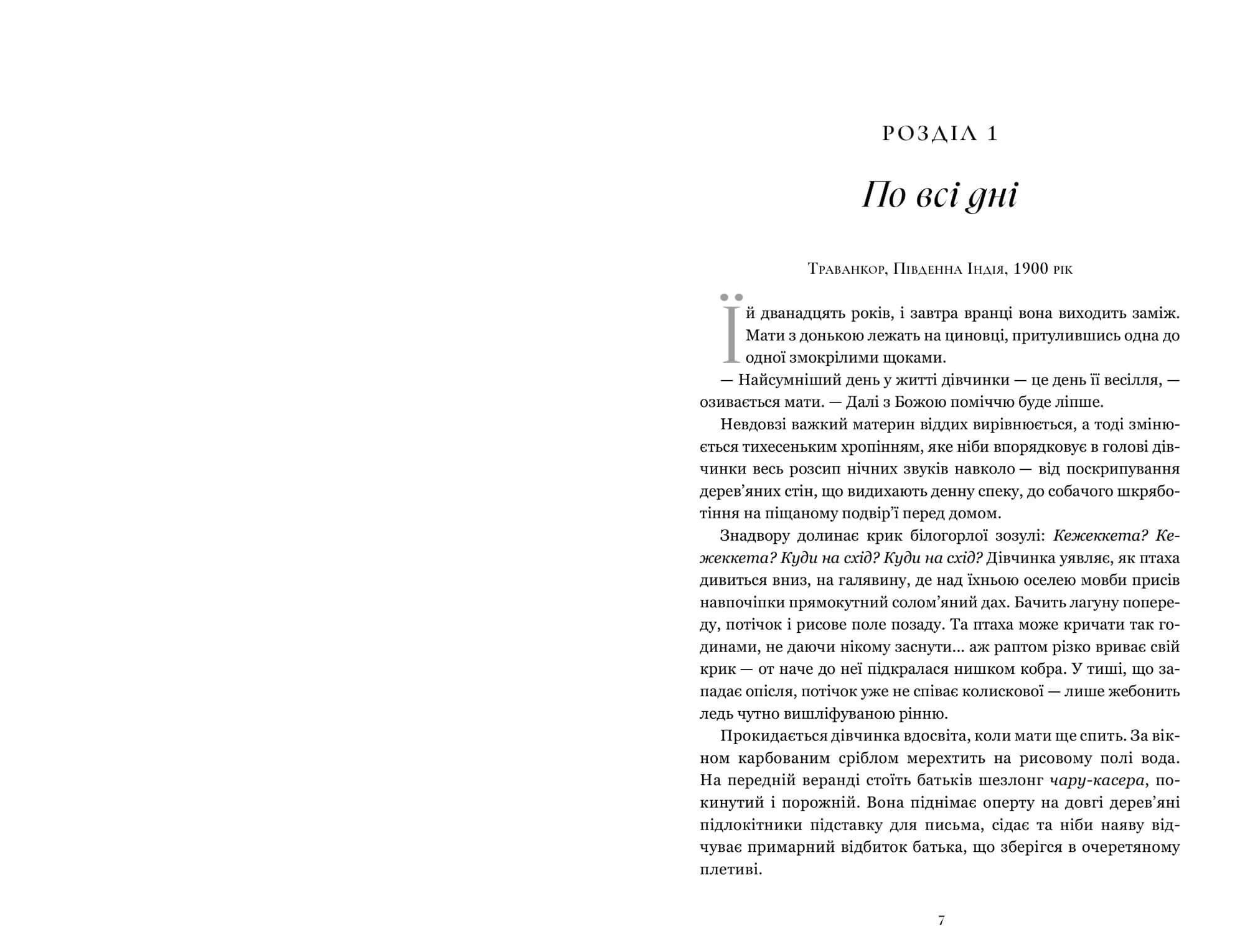 На початку роману дванадцятирічну дівчинку відправляють на човні на весілля, де вона вперше зустрічає свого чоловіка. Вона приєднується до заможної родини і стає Великою Аммачі, матріархом надзвичайної родини, яка переживе труднощі, святкуватиме тріумфи і стане свідком немислимих змін протягом наступних десятиліть.