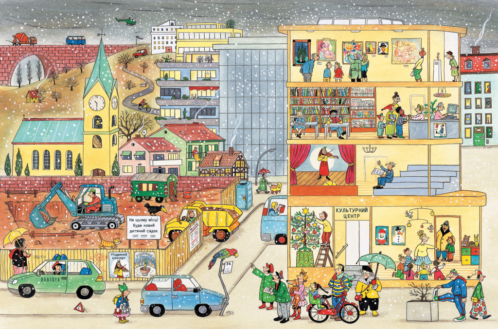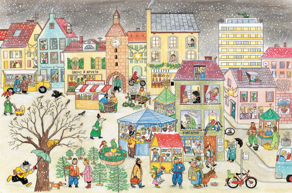 У повітрі запахло зимою, скоро почнуть падати перші сніжинки. Ротраут Сузанне Бернер розповідає через малюнки багато маленьких історій, які трапляються з людьми та тваринами в містечку Мала Метушня звичайного зимового дня: пані Марія знову запізнилася на автобус, папуга Ліни вирішив прогулятися... Ой, а хто це загубив червоний гаманець?